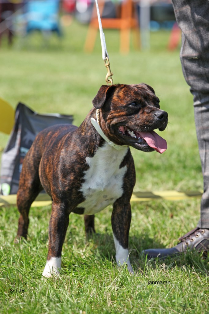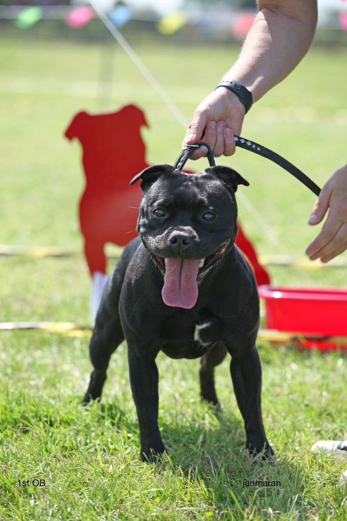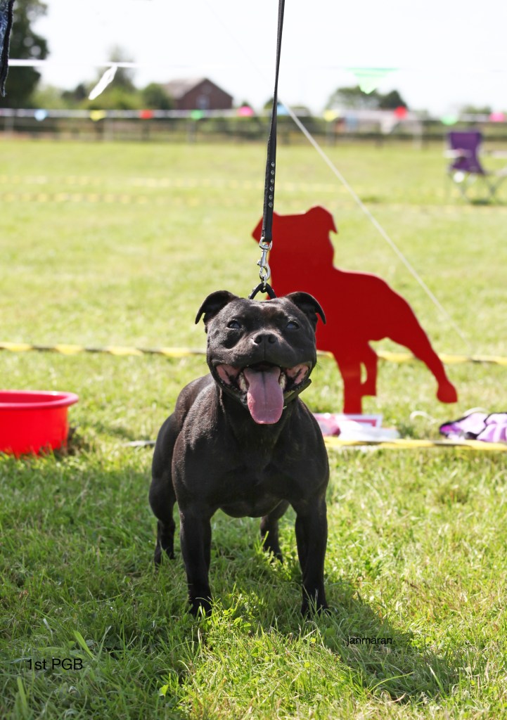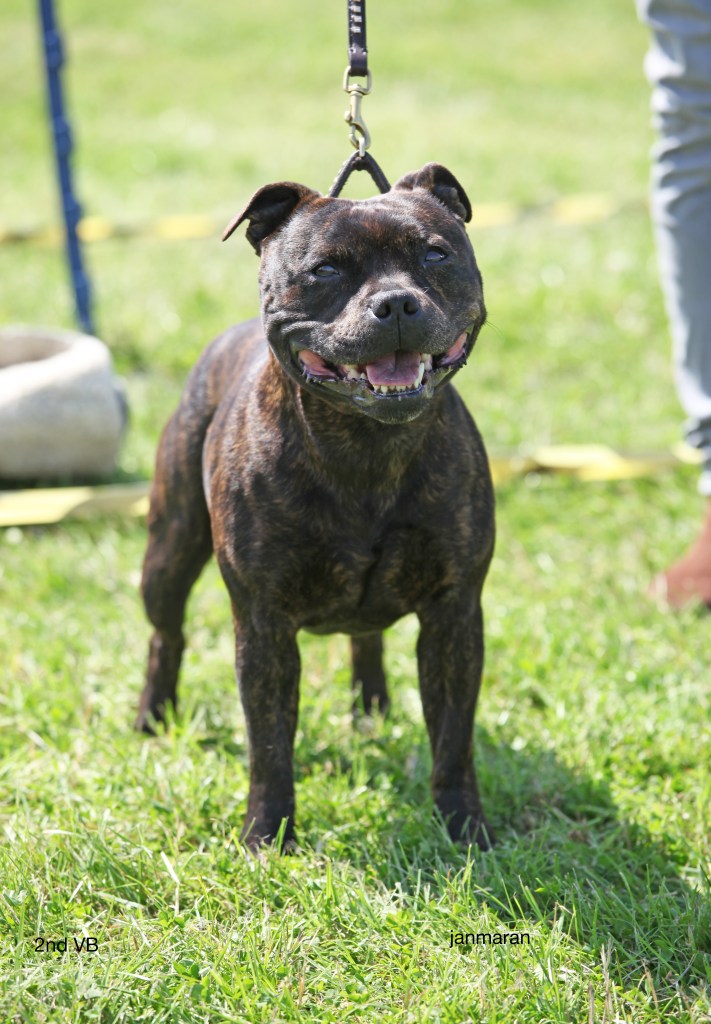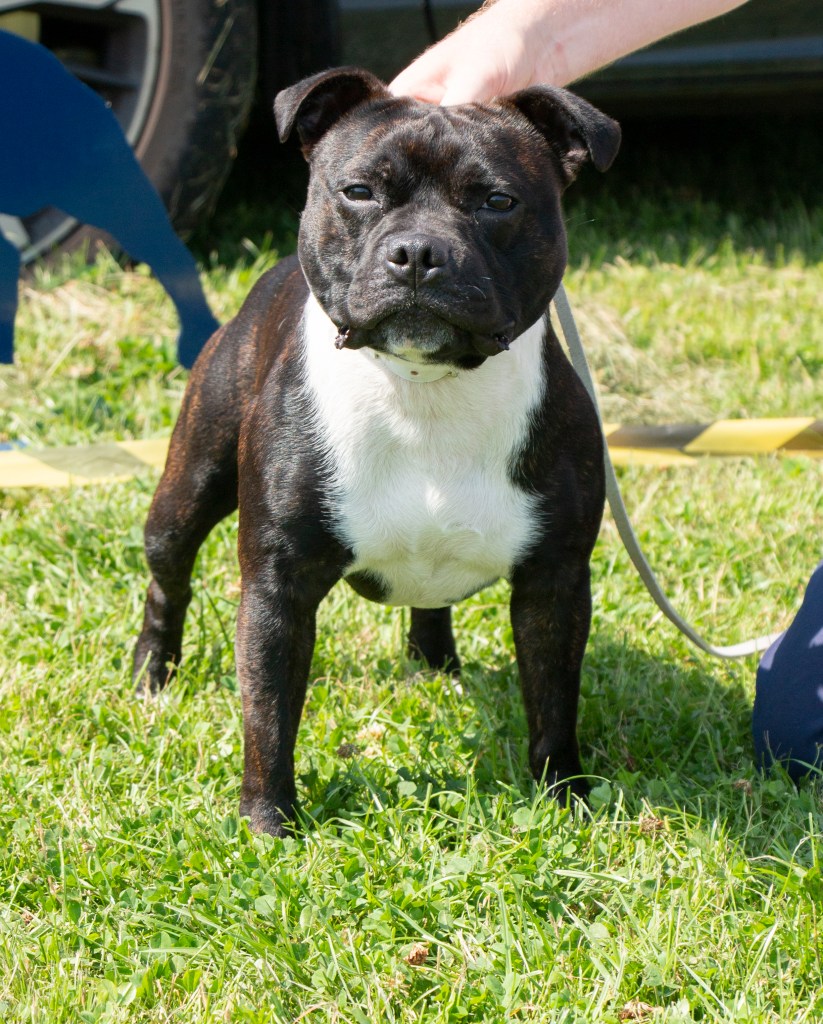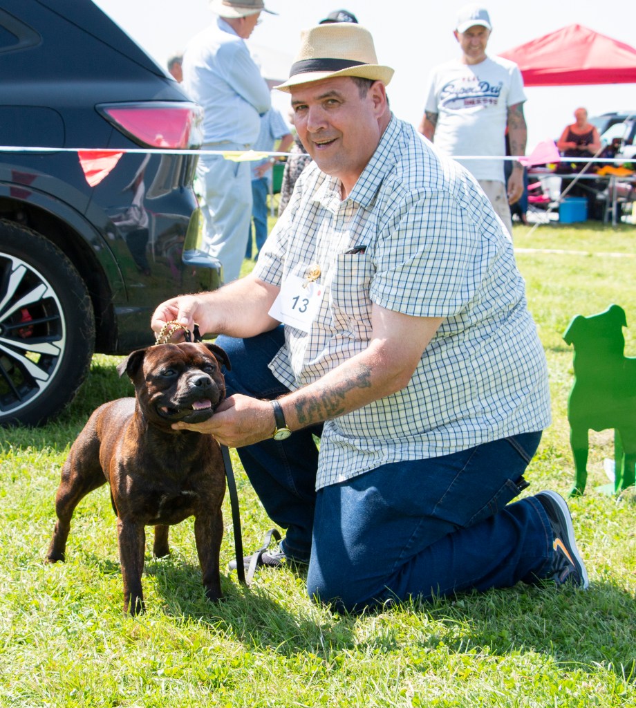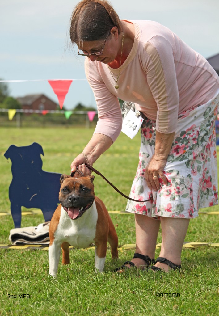 What a day it was! My thanks to the Officers and Committee of the North West SBTC for the invitation to Judge their Anniversary show and for putting on a fantastic day – brilliant atmosphere and very well organised too. The weather was very hot and sunny all day and it did have an effect on some exhibits as they were drained by the sheer heat but owners did their very best and kept them in cool coats etc and I also offered them the choice to leave the ring out of the sun. There were a few delays inbetween some classes due to clashing with the open show, which was unavoidable. The overall quality of what I examined was very good, I Judged them on the day as they stood and performed before me and I know it’s a well used phrase but placings could change on any given day and I’m sure some will. There is a lot of top notch bitches coming through in the younger classes and it is heartening to see that the breed has a good future. In my opinion Covid lockdown certainly hasn’t affected the behaviour of these canine ladies, they were all impeccable and have been trained well during their home schooling with admirable temperaments too. Most seemed to be in good condition although there were a few with quite dirty teeth. Bites were good on the whole with just the odd misplaced tooth; I did not see any major faults. Most were good movers, however some did move in very close at the rear and lacked drive. Thank you for accepting and being sportsmanlike in applauding my decisions; Stafford people really are the best at supporting each other and being happy for someone else. Thank you to my superb ring stewards Elaine Norton and Jan Matthews – you did a brilliant job and in the heat of the day you never dropped a beat!
