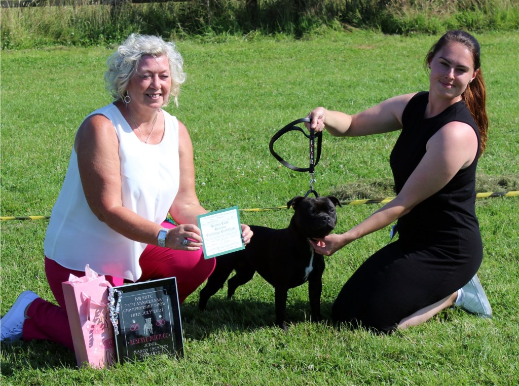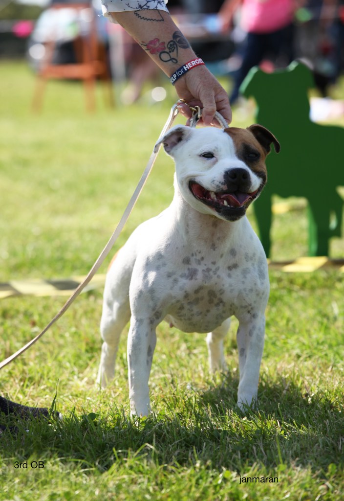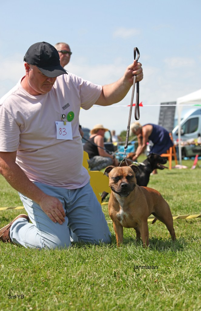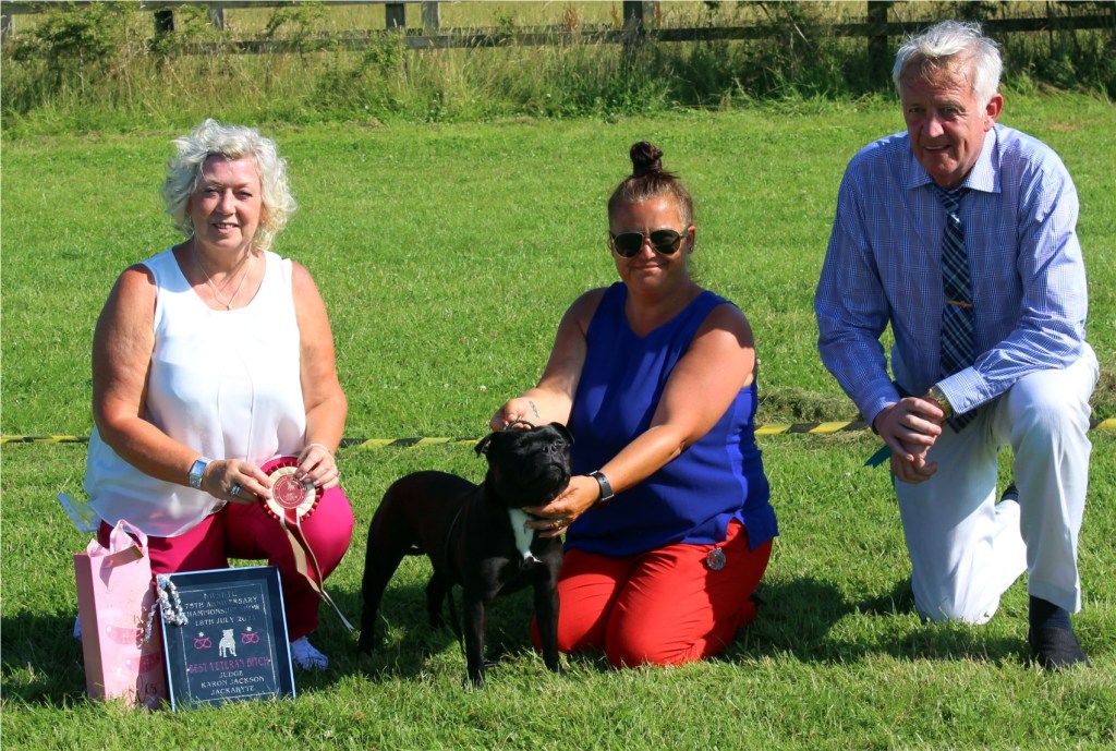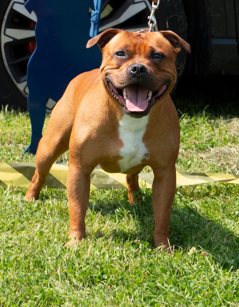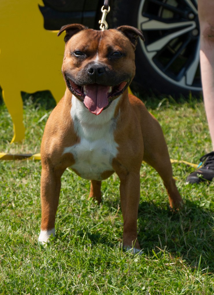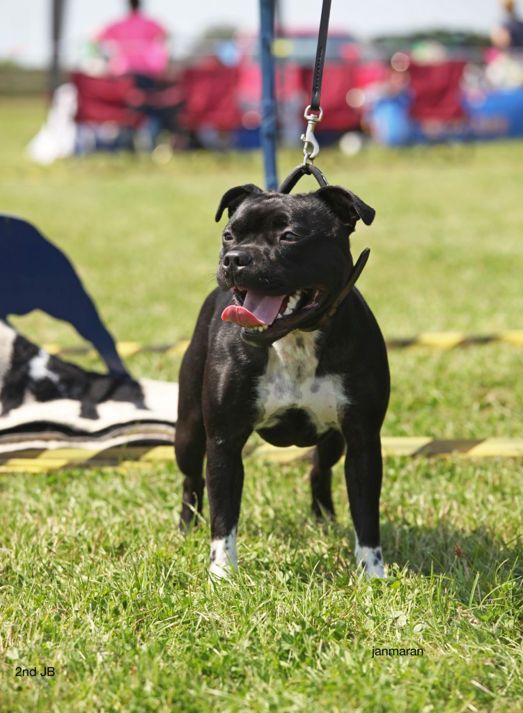 What a day it was! My thanks to the Officers and Committee of the North West SBTC for the invitation to Judge their Anniversary show and for putting on a fantastic day – brilliant atmosphere and very well organised too. The weather was very hot and sunny all day and it did have an effect on some exhibits as they were drained by the sheer heat but owners did their very best and kept them in cool coats etc and I also offered them the choice to leave the ring out of the sun. There were a few delays inbetween some classes due to clashing with the open show, which was unavoidable. The overall quality of what I examined was very good, I Judged them on the day as they stood and performed before me and I know it’s a well used phrase but placings could change on any given day and I’m sure some will. There is a lot of top notch bitches coming through in the younger classes and it is heartening to see that the breed has a good future. In my opinion Covid lockdown certainly hasn’t affected the behaviour of these canine ladies, they were all impeccable and have been trained well during their home schooling with admirable temperaments too. Most seemed to be in good condition although there were a few with quite dirty teeth. Bites were good on the whole with just the odd misplaced tooth; I did not see any major faults. Most were good movers, however some did move in very close at the rear and lacked drive. Thank you for accepting and being sportsmanlike in applauding my decisions; Stafford people really are the best at supporting each other and being happy for someone else. Thank you to my superb ring stewards Elaine Norton and Jan Matthews – you did a brilliant job and in the heat of the day you never dropped a beat!