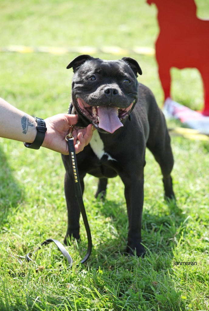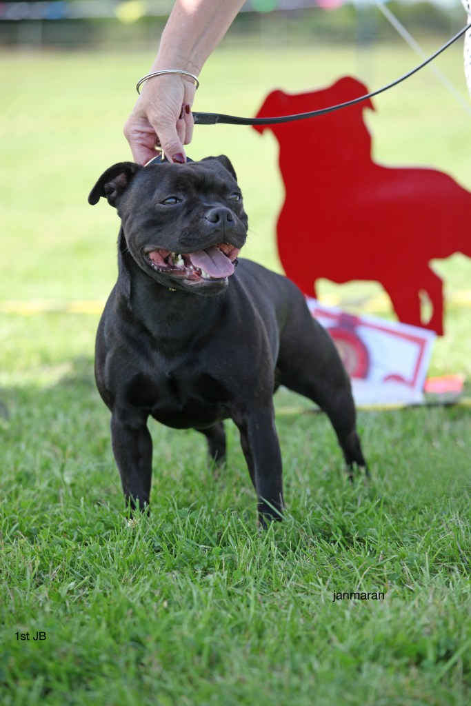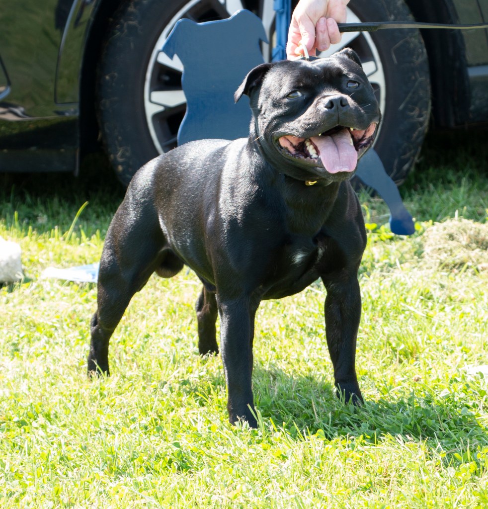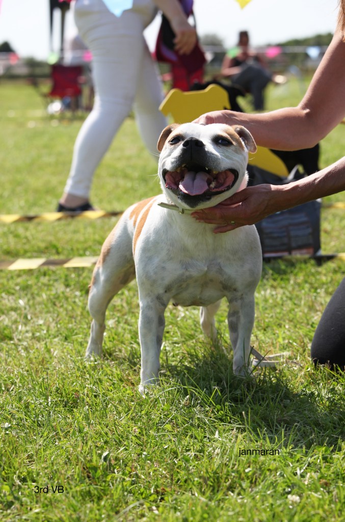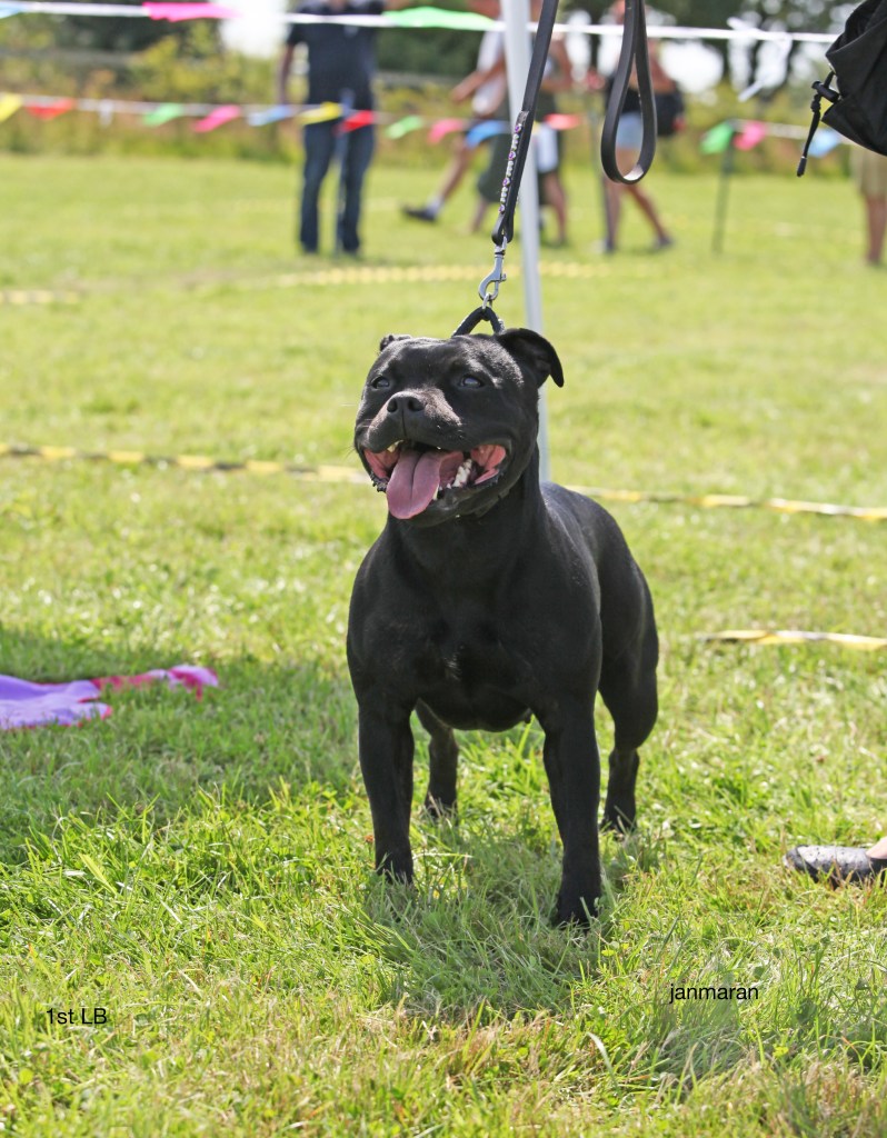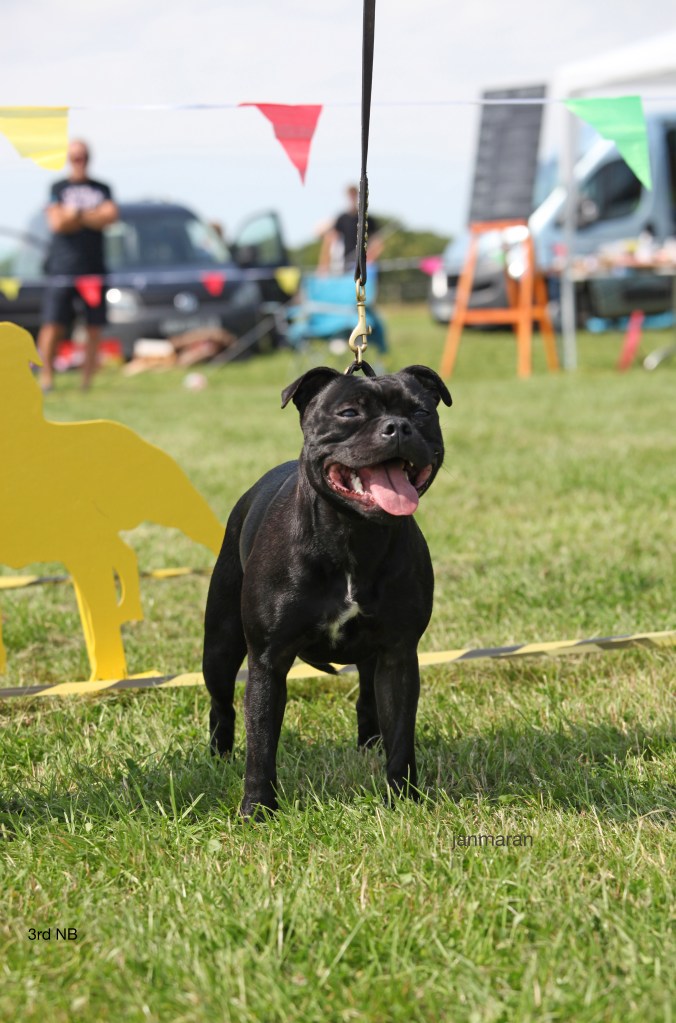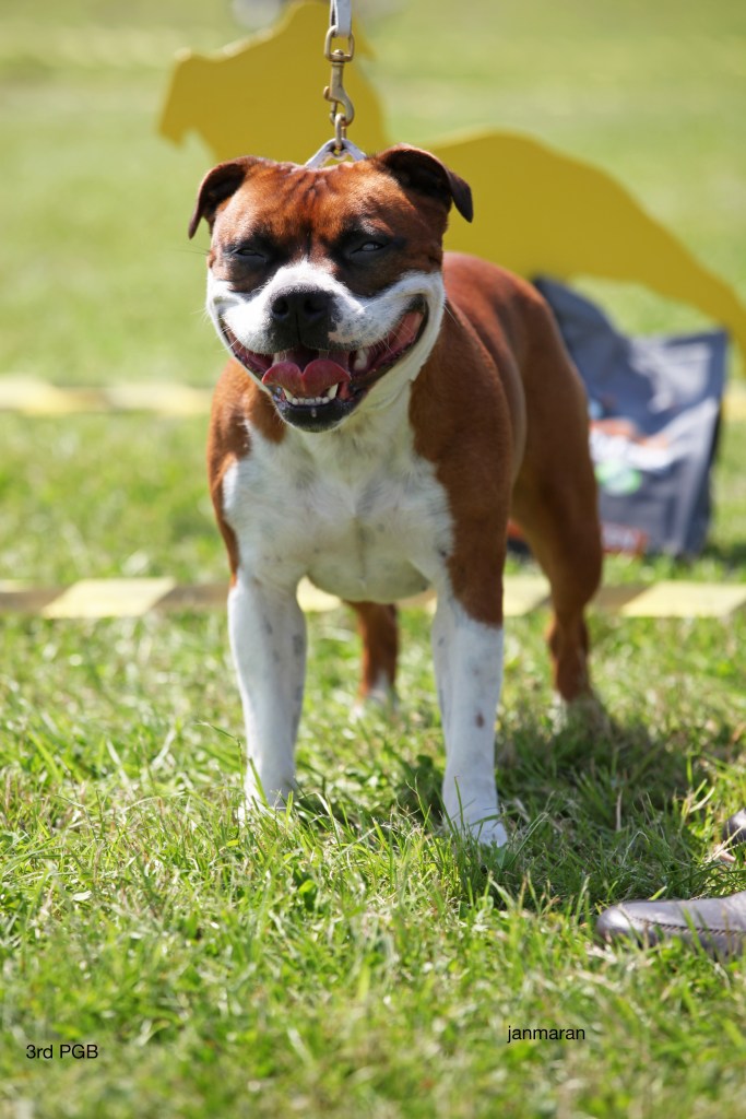 What a day it was! My thanks to the Officers and Committee of the North West SBTC for the invitation to Judge their Anniversary show and for putting on a fantastic day – brilliant atmosphere and very well organised too. The weather was very hot and sunny all day and it did have an effect on some exhibits as they were drained by the sheer heat but owners did their very best and kept them in cool coats etc and I also offered them the choice to leave the ring out of the sun. There were a few delays inbetween some classes due to clashing with the open show, which was unavoidable. The overall quality of what I examined was very good, I Judged them on the day as they stood and performed before me and I know it’s a well used phrase but placings could change on any given day and I’m sure some will. There is a lot of top notch bitches coming through in the younger classes and it is heartening to see that the breed has a good future. In my opinion Covid lockdown certainly hasn’t affected the behaviour of these canine ladies, they were all impeccable and have been trained well during their home schooling with admirable temperaments too. Most seemed to be in good condition although there were a few with quite dirty teeth. Bites were good on the whole with just the odd misplaced tooth; I did not see any major faults. Most were good movers, however some did move in very close at the rear and lacked drive. Thank you for accepting and being sportsmanlike in applauding my decisions; Stafford people really are the best at supporting each other and being happy for someone else. Thank you to my superb ring stewards Elaine Norton and Jan Matthews – you did a brilliant job and in the heat of the day you never dropped a beat!