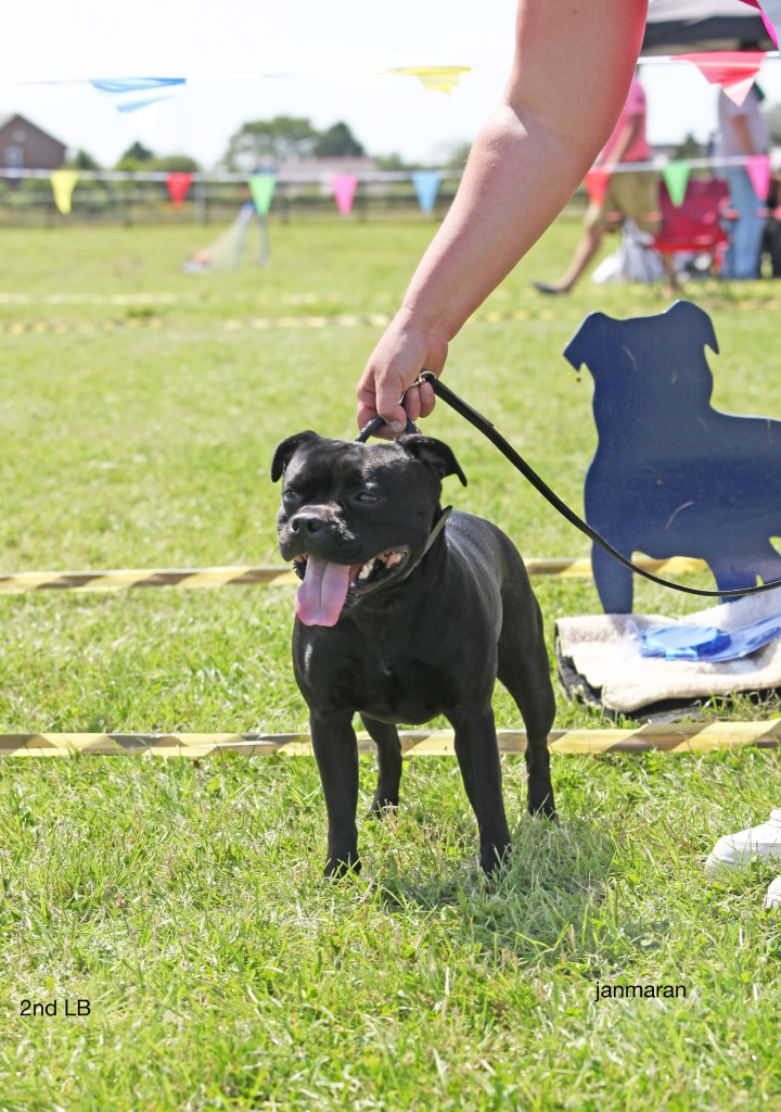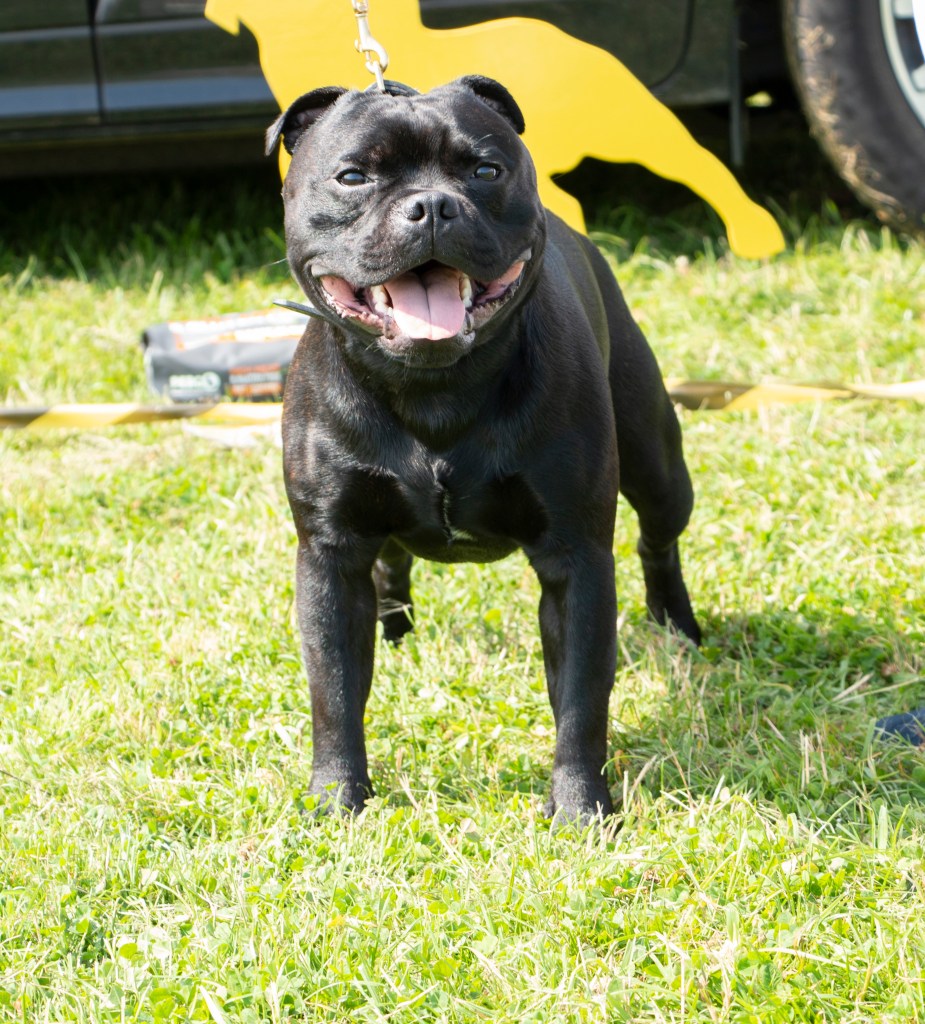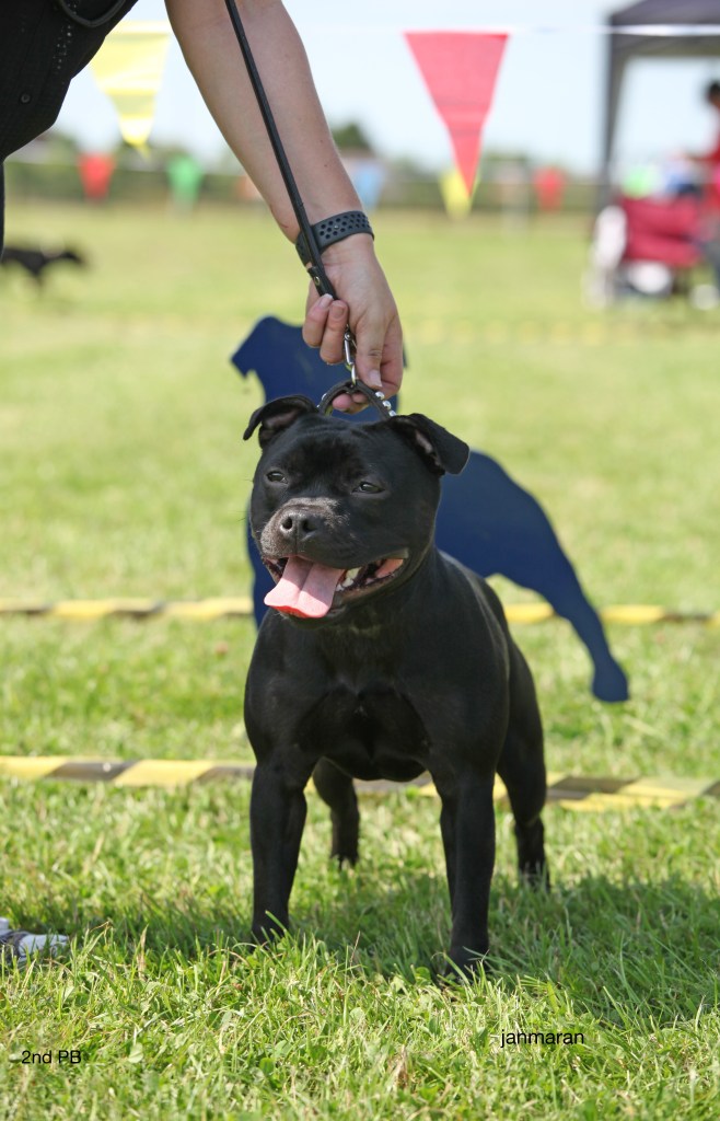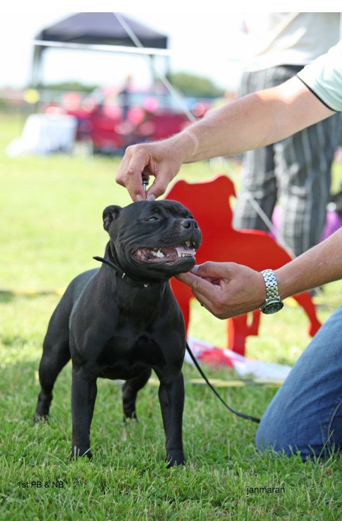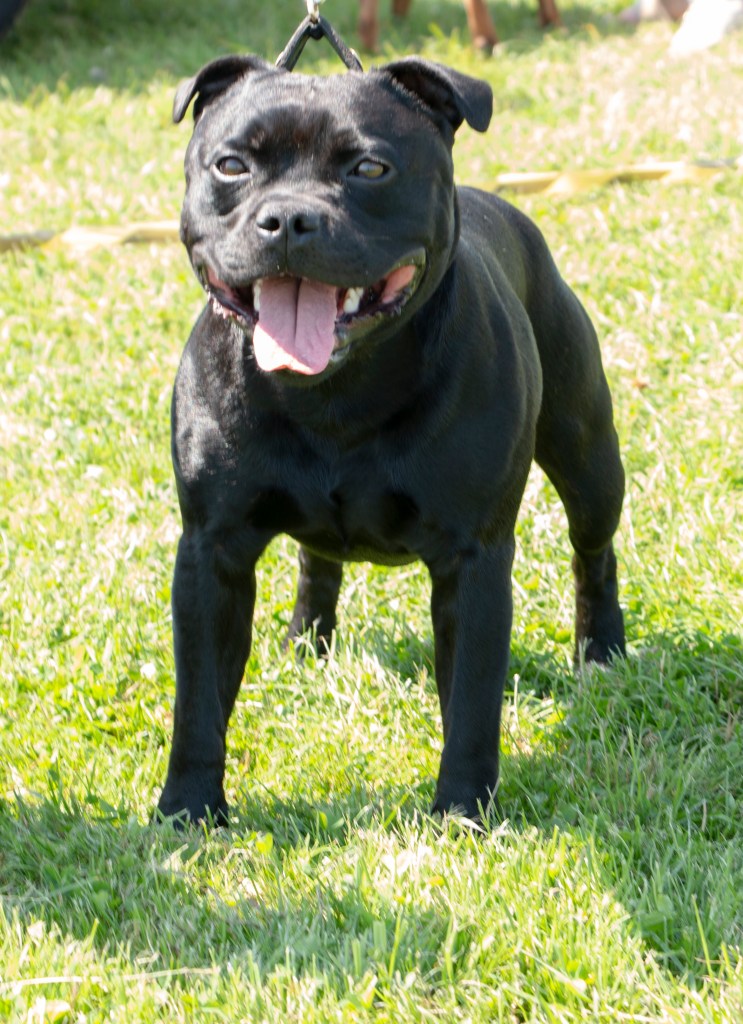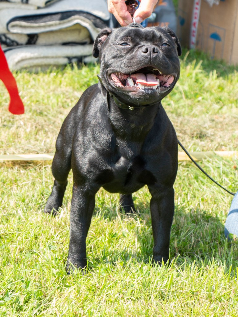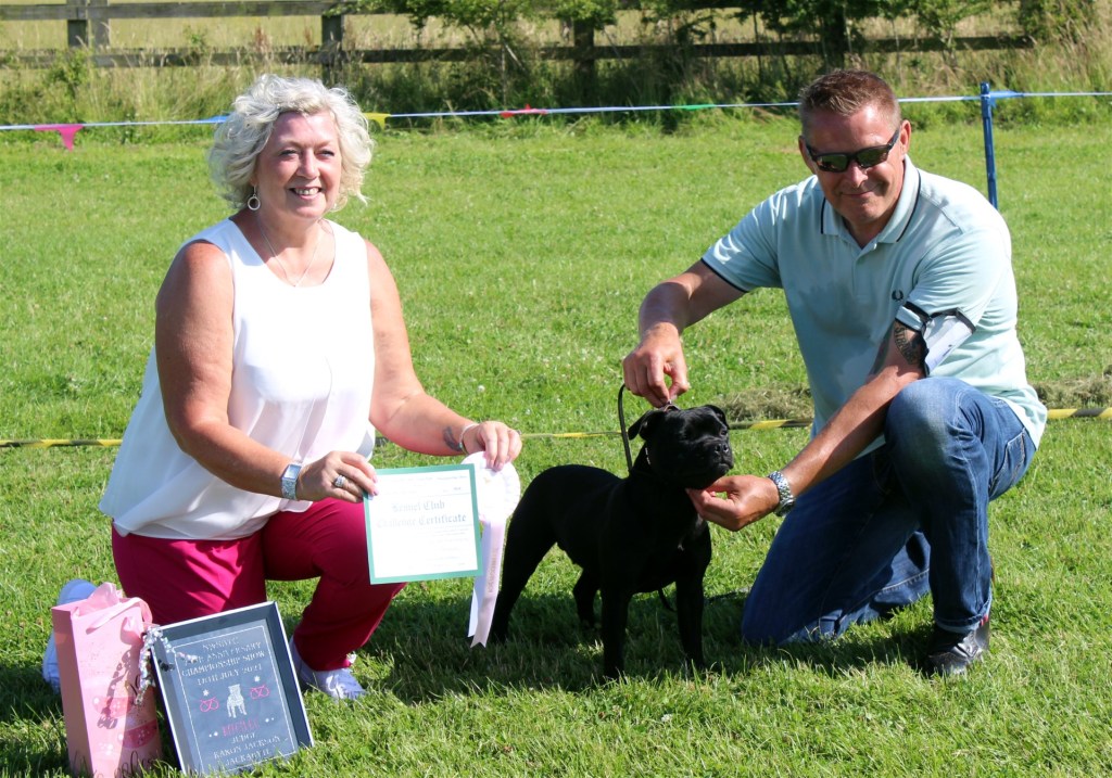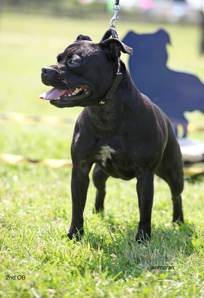 What a day it was! My thanks to the Officers and Committee of the North West SBTC for the invitation to Judge their Anniversary show and for putting on a fantastic day – brilliant atmosphere and very well organised too. The weather was very hot and sunny all day and it did have an effect on some exhibits as they were drained by the sheer heat but owners did their very best and kept them in cool coats etc and I also offered them the choice to leave the ring out of the sun. There were a few delays inbetween some classes due to clashing with the open show, which was unavoidable. The overall quality of what I examined was very good, I Judged them on the day as they stood and performed before me and I know it’s a well used phrase but placings could change on any given day and I’m sure some will. There is a lot of top notch bitches coming through in the younger classes and it is heartening to see that the breed has a good future. In my opinion Covid lockdown certainly hasn’t affected the behaviour of these canine ladies, they were all impeccable and have been trained well during their home schooling with admirable temperaments too. Most seemed to be in good condition although there were a few with quite dirty teeth. Bites were good on the whole with just the odd misplaced tooth; I did not see any major faults. Most were good movers, however some did move in very close at the rear and lacked drive. Thank you for accepting and being sportsmanlike in applauding my decisions; Stafford people really are the best at supporting each other and being happy for someone else. Thank you to my superb ring stewards Elaine Norton and Jan Matthews – you did a brilliant job and in the heat of the day you never dropped a beat!