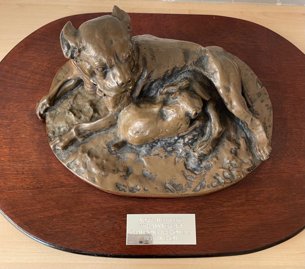 The Mansel Frayne artwork (left) presented to the BIS winner was originally purchased by the Club as an annual trophy – The Harry Latham award for the breeder accumulating the most points at the three Club shows each year. So we put it to good use after many years stored at Steve & Julie Simpson’s the last winner more than 10 years ago.