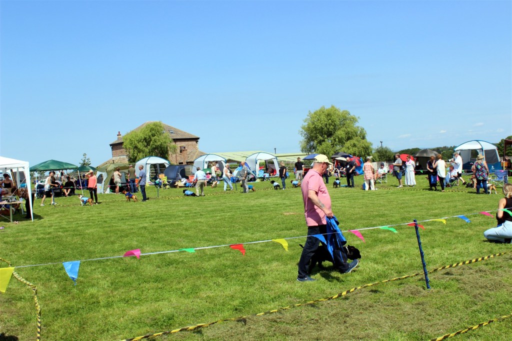 Elaine and Tec Norton (the author of this report) stayed overnight on site and the above photo at the head of this page was taken at sunrise over Winter Hill on show day, the show area shrouded in mist – rather ethereal. This was a prelude to what was to come weather-wise – a sweltering hot day, not good for showing dogs but most people came prepared and the assortment of tents provided cover for most.