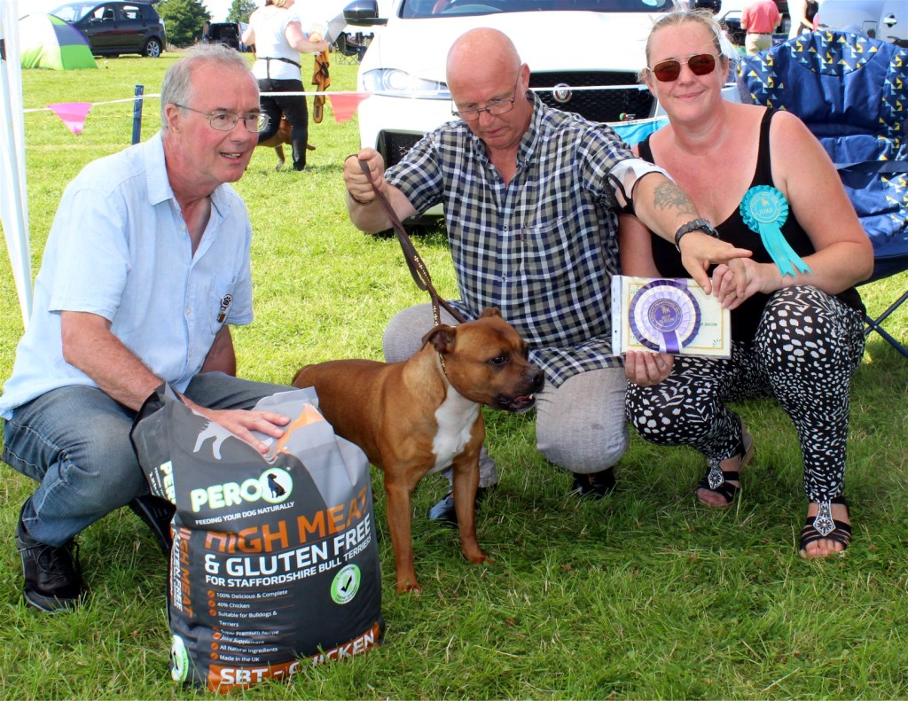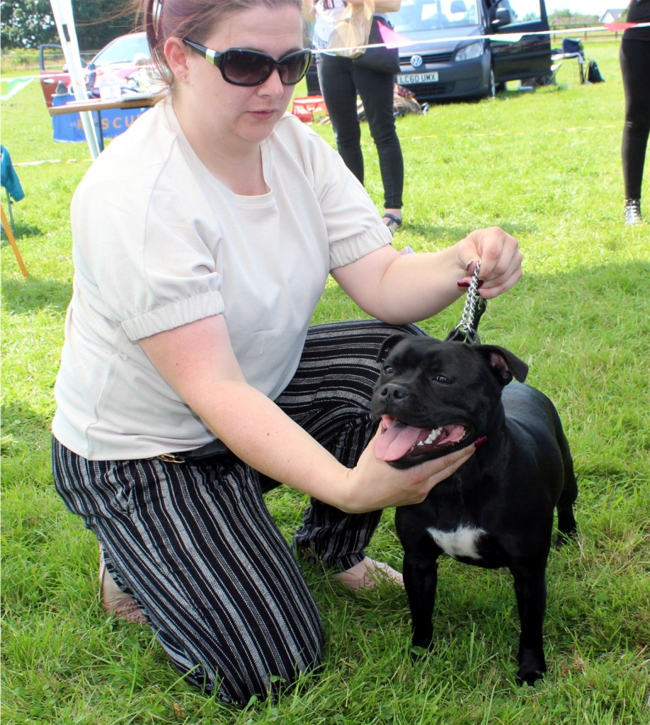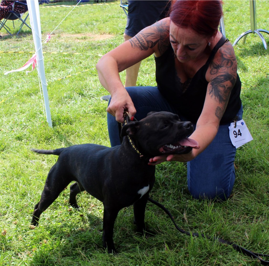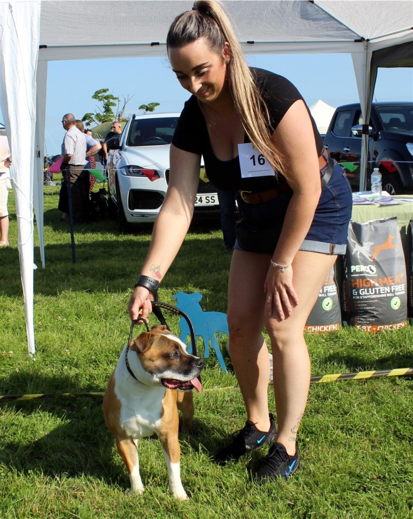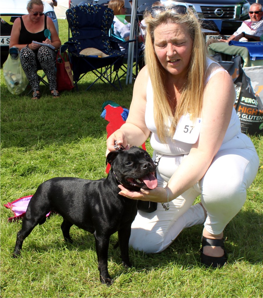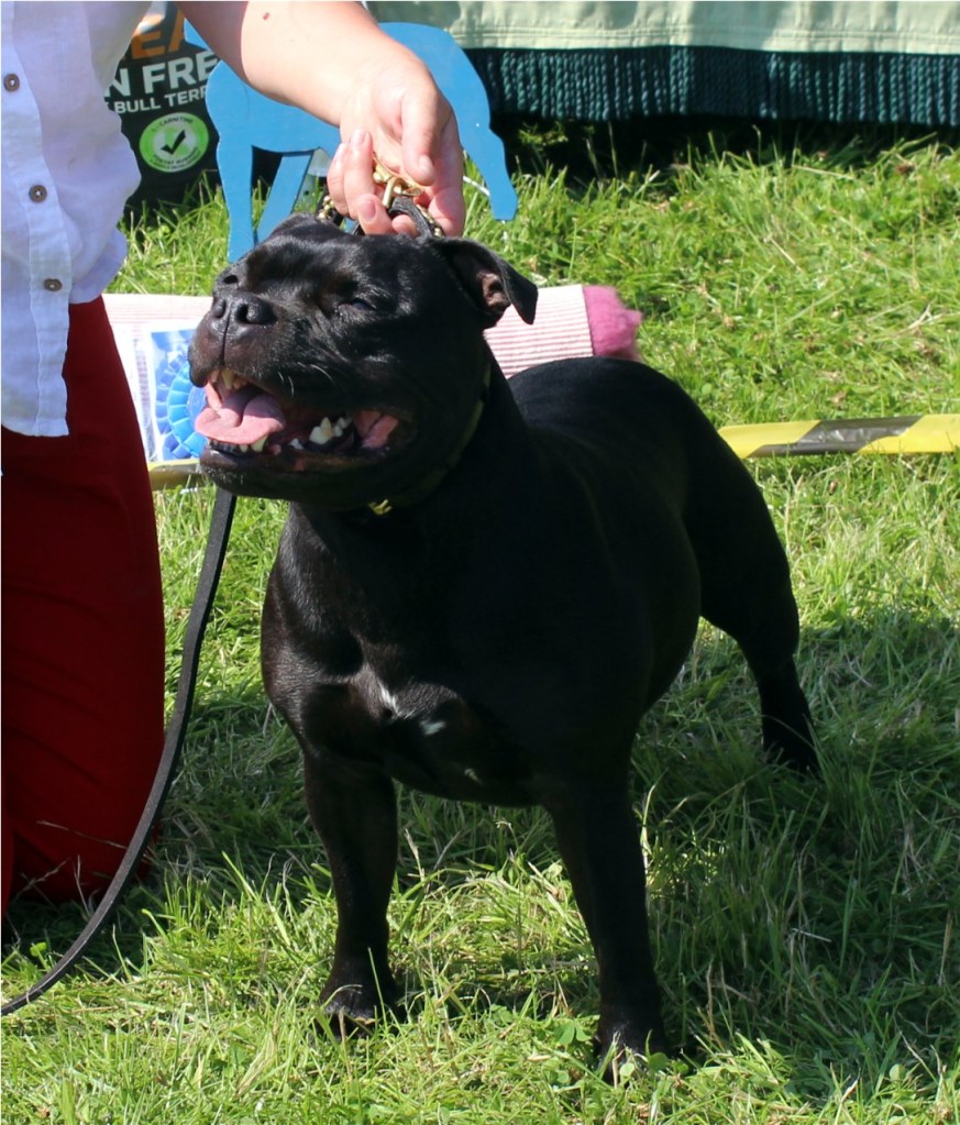 1st, Best Bitch & Reserve Best In Show McVay & Hughes’ – Tillcarr Halo Of Fire – Nearly 14 months black brindle with white chest, when I saw this girl I did a double take as she reminded me of one of my own dogs, classic Stafford head shape strong and clean, dark round eyes and neat ears which she used to her advantage it give her a cracking expression, straight front with a good depth of brisket, close coupled and powerful rear quarters completed the picture, she moved well around the ring holding her topline. That expression though won her the class and best bitch too she is a really cracking bitch. BB