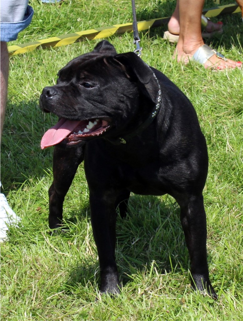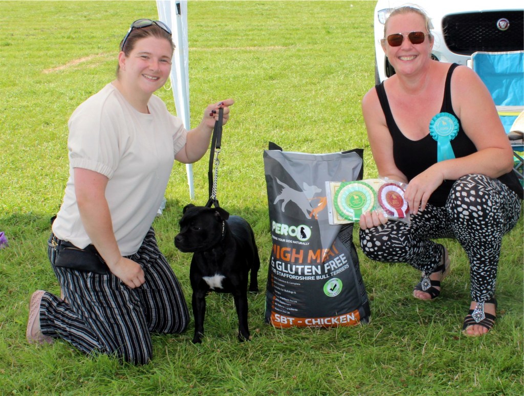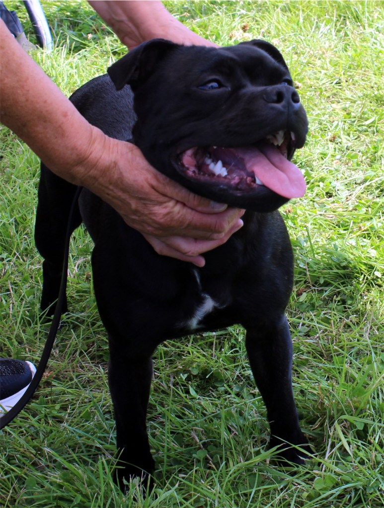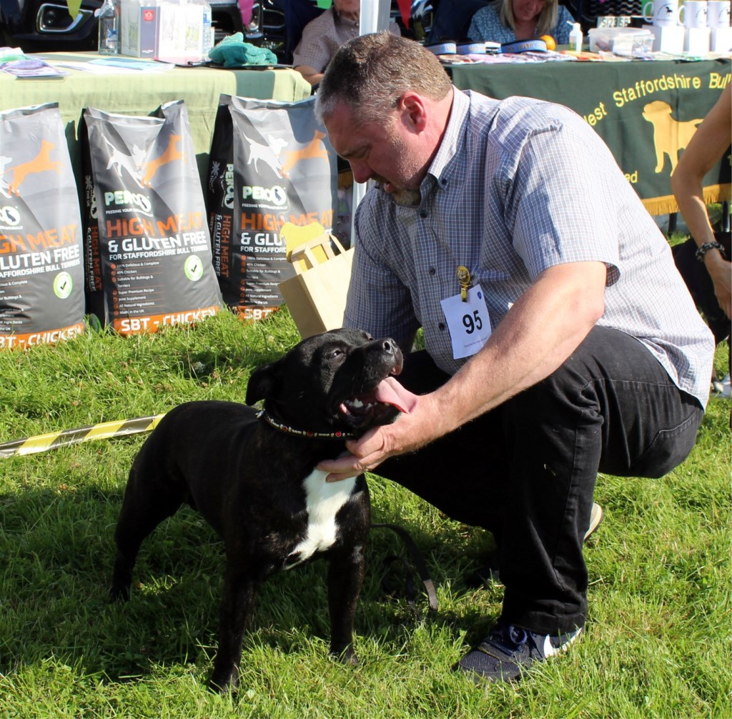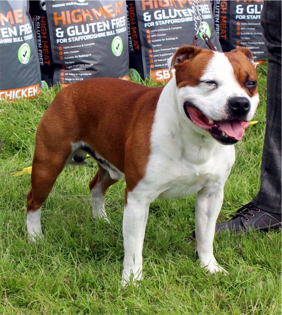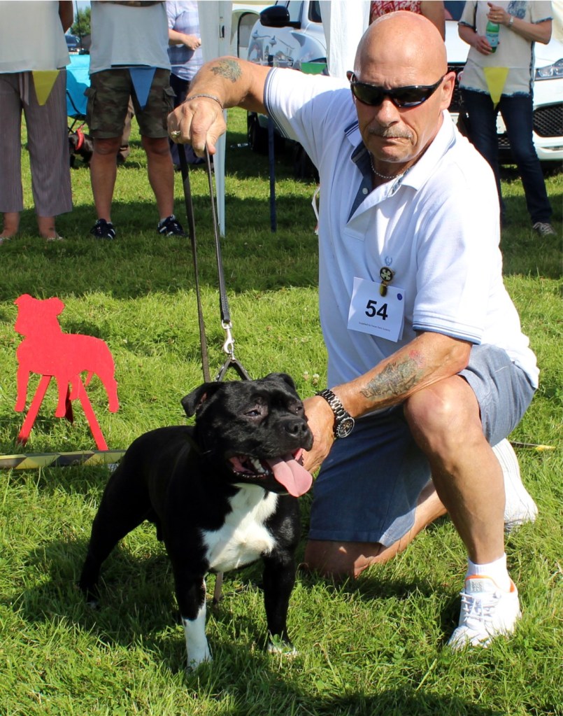 1st, Best Bitch & Reserve Best In Show McVay & Hughes’ – Tillcarr Halo Of Fire – Nearly 14 months black brindle with white chest, when I saw this girl I did a double take as she reminded me of one of my own dogs, classic Stafford head shape strong and clean, dark round eyes and neat ears which she used to her advantage it give her a cracking expression, straight front with a good depth of brisket, close coupled and powerful rear quarters completed the picture, she moved well around the ring holding her topline. That expression though won her the class and best bitch too she is a really cracking bitch. BB