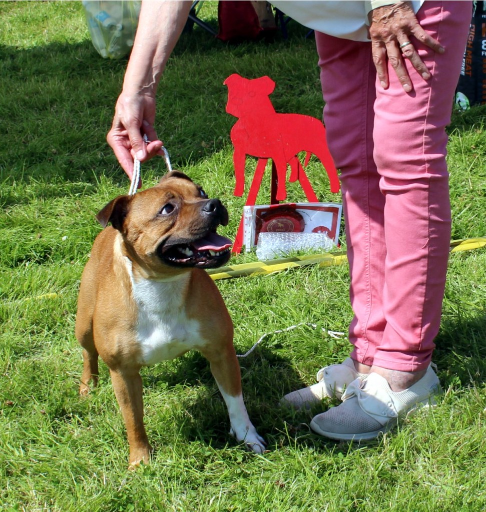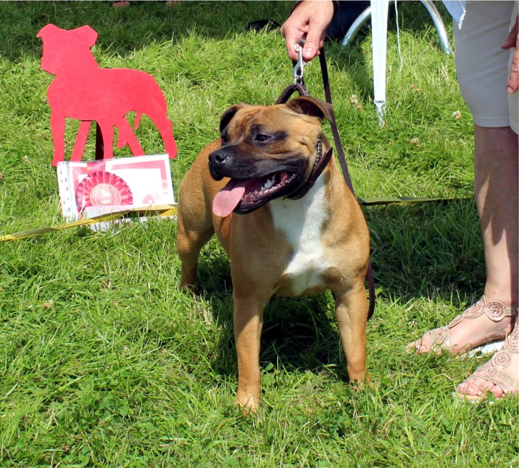 1st Best Puppy Dog and Best Puppy in Show Hammond’s Hammystaff Red Revenge, 8 months old beautiful deep red colour with white chest, cracking well defined head shape, lovely round dark eye and correct ears both of which added to his expression which is typical Stafford, straight front with good bone and enough brisket for his age, level topline which he held on the move, close coupled with good rear construction, he is fit and well muscled, correct tailset, once settled he moved with drive around the ring and watching him made me smile involuntarily.