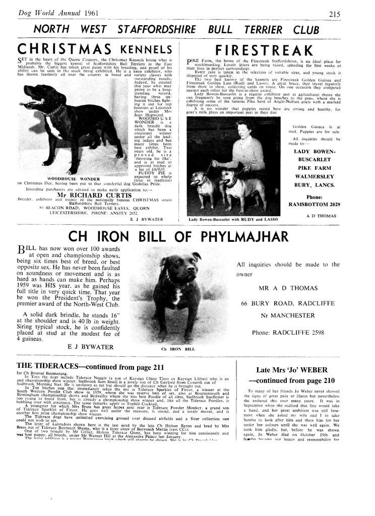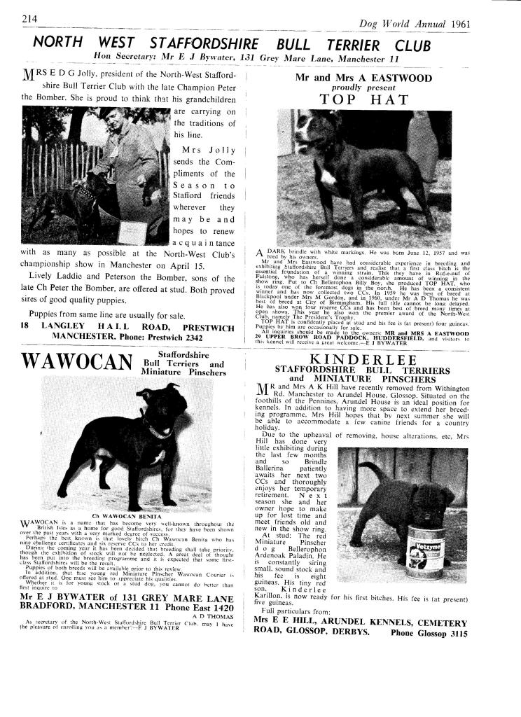Through the ‘fifties and ‘sixties, many who were to become successful exhibitors and notable North West men and women joined the Club adding to its standing and strength. To name them all would be impossible but again in the 1961 Dog World NW advertisers (above) include the Bywaters (Wawocan); Evie Hill (Kinderlee) and Mrs Jolly who was the Club President at the time, with her Ch Peter The Bomber.