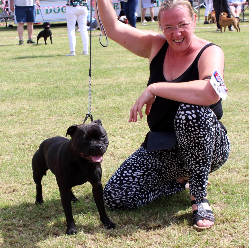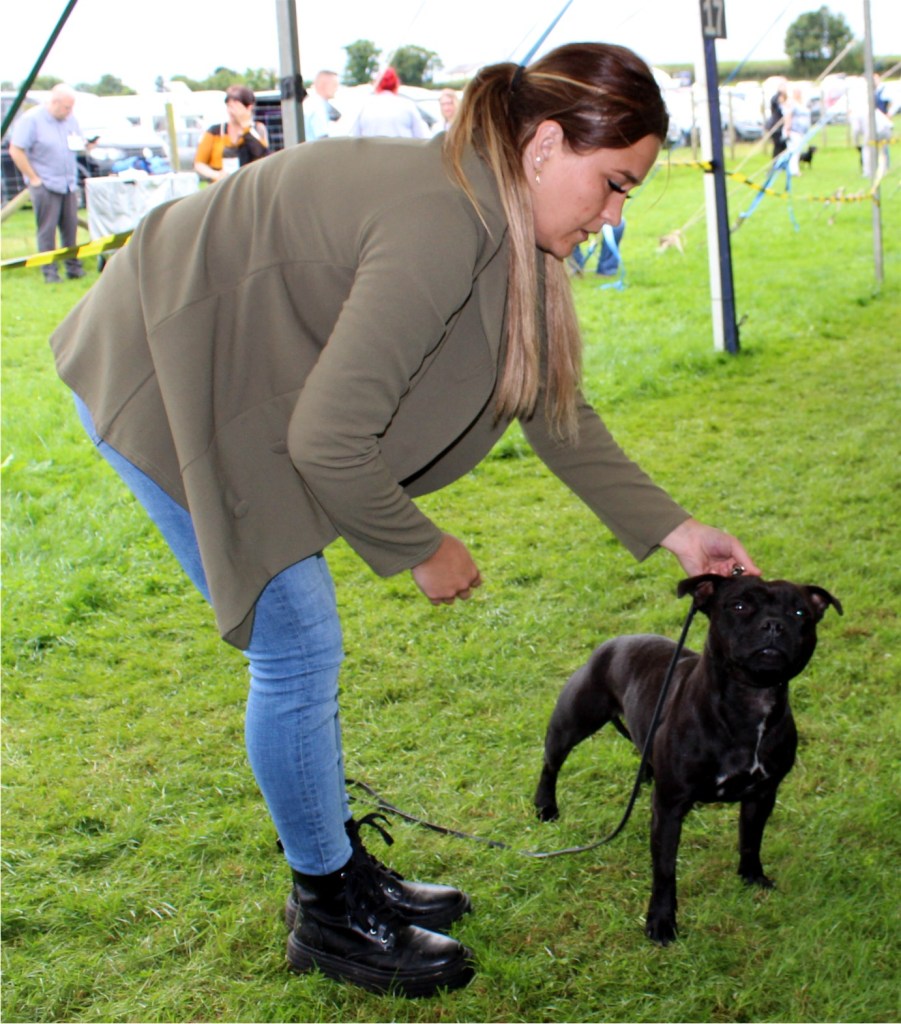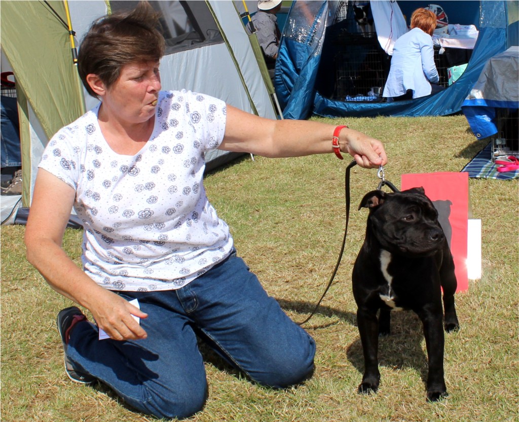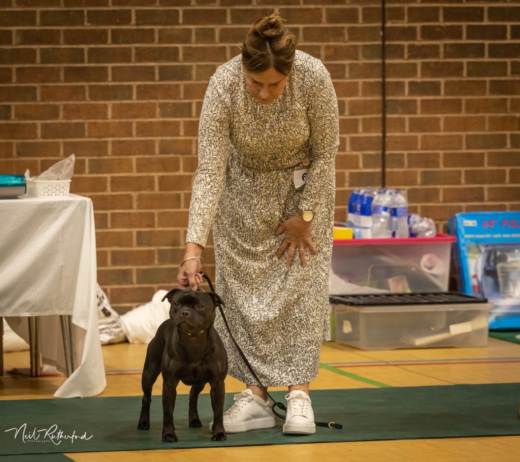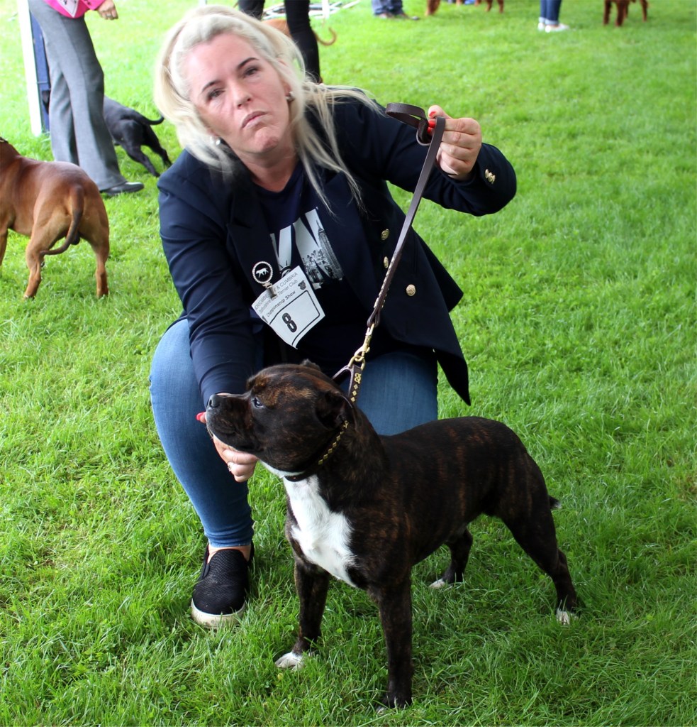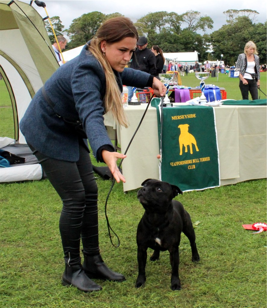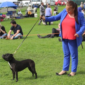 Kate Burrow’s Rossobull Iggle Piggle took a very creditable second place in a very strong Yearling Dog class and then moved up a place in the Novice class – although Kate doesn’t look too pleased on this shot.