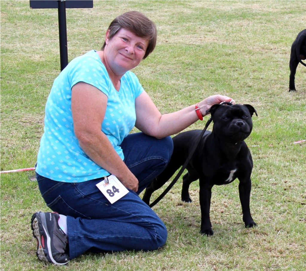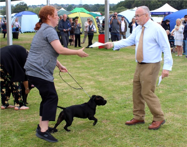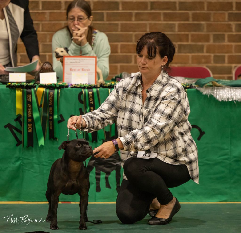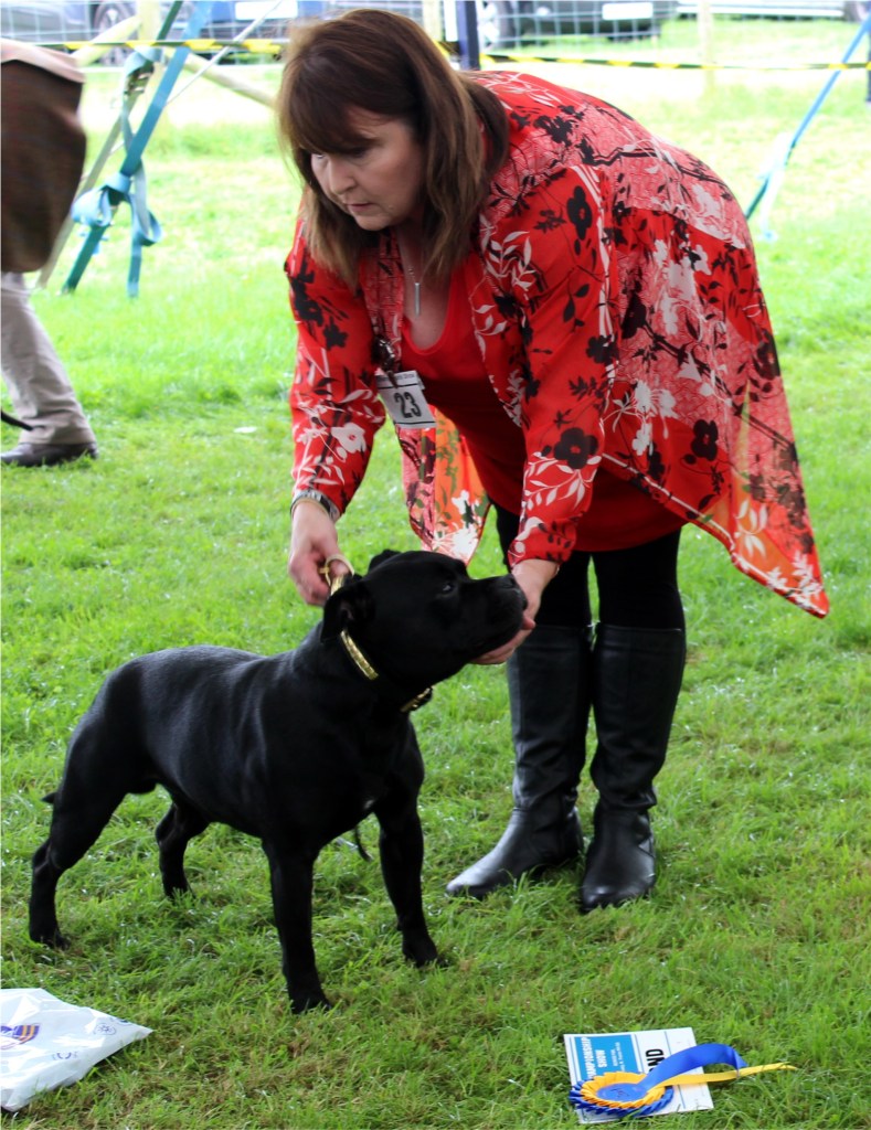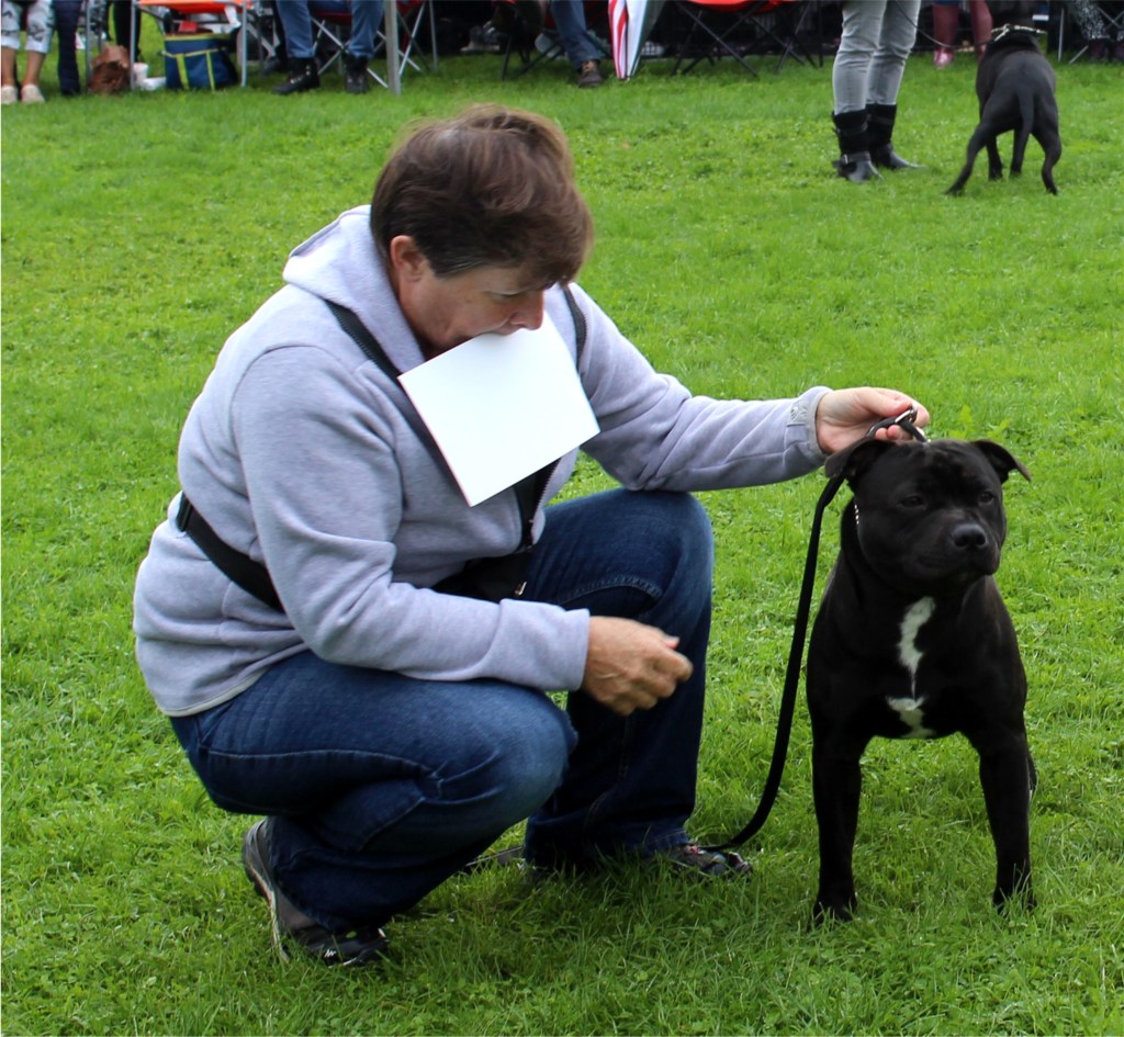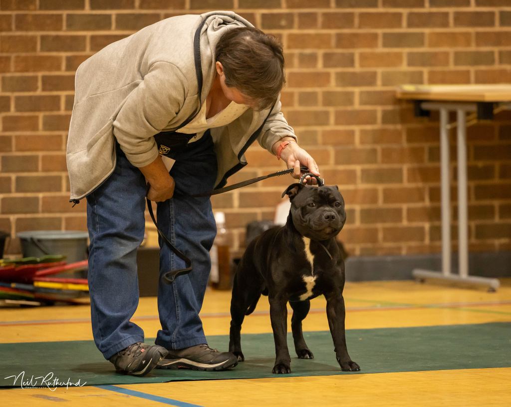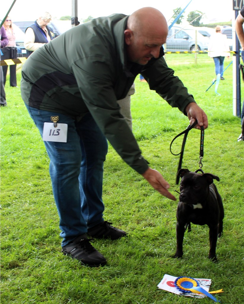 Kate Burrow’s Rossobull Iggle Piggle took a very creditable second place in a very strong Yearling Dog class and then moved up a place in the Novice class – although Kate doesn’t look too pleased on this shot.