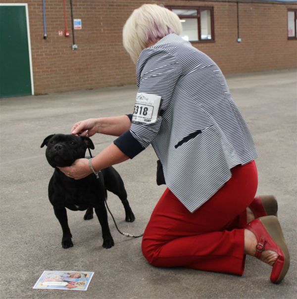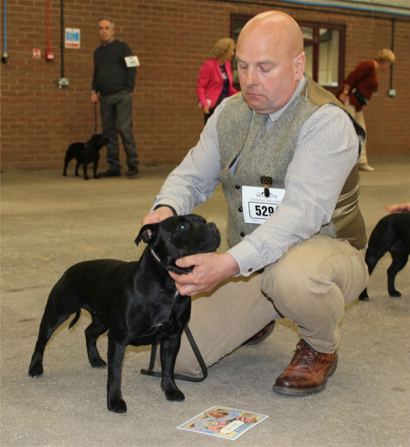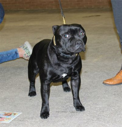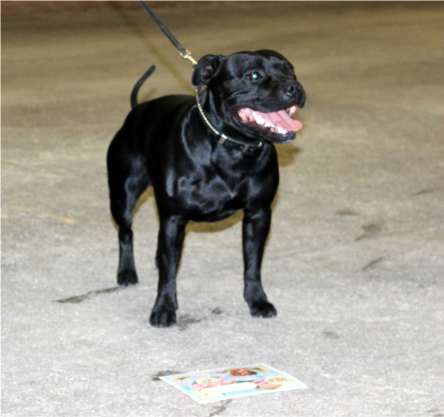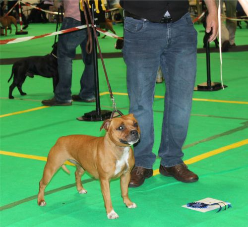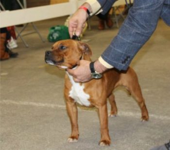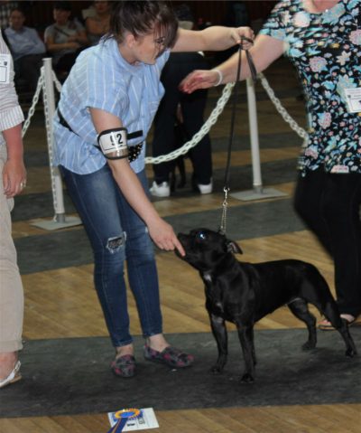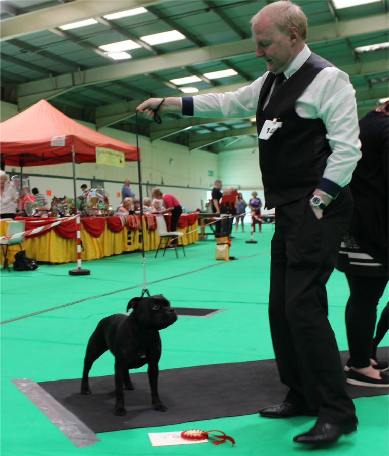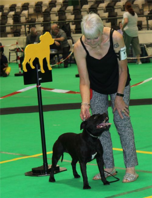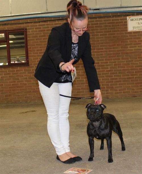 It was in this class when taking a photo of our bitch in 4th place (Tikkurilan Spot On) that I noticed in 5th place was Chris Howard and her bitch Caymenstaffs Little Minx – this is the result – a few things going on here which I only realised when I processed these photos.