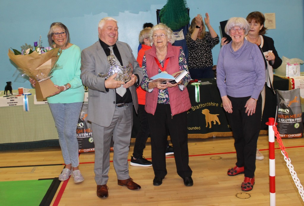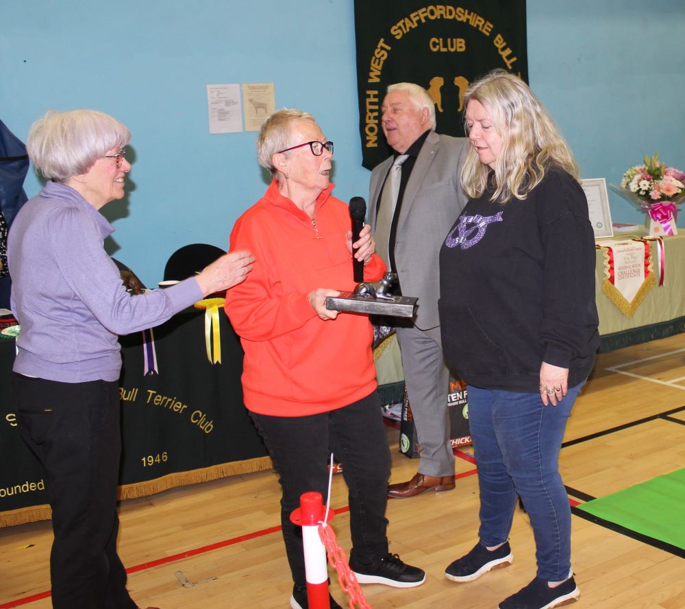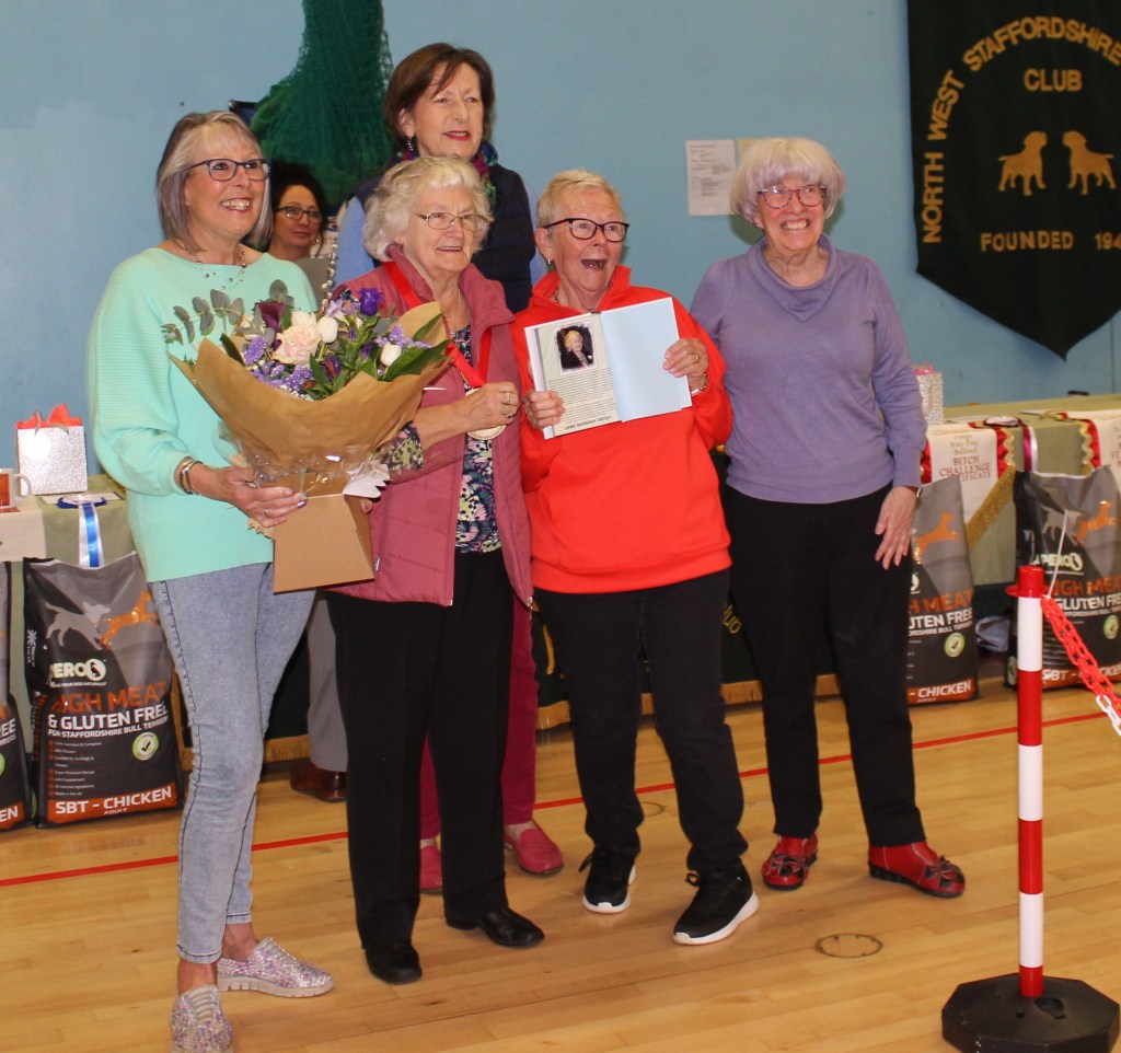 Veronica Wardleworth and Audrey Hubery representing the Gallimore Trust and Stafford Welfare respectively were both at the show to make a presentation on their behalf (and all Stafford lovers everywhere) to Barbara Green in recognition of her incredible dedication and long service to rescuing Staffordshire Bull Terriers.
