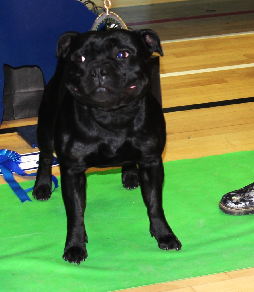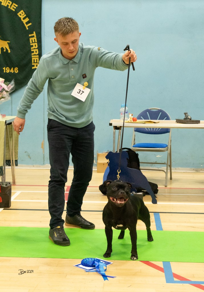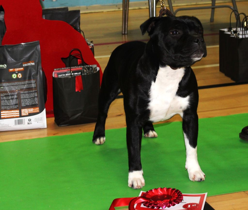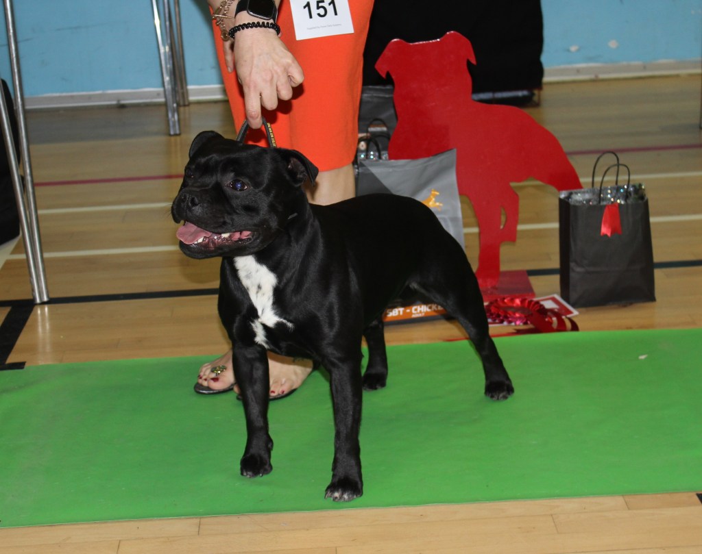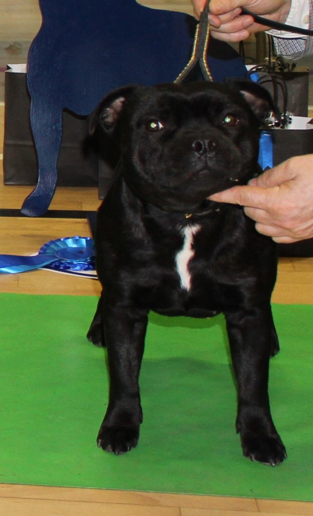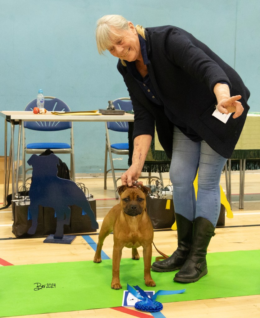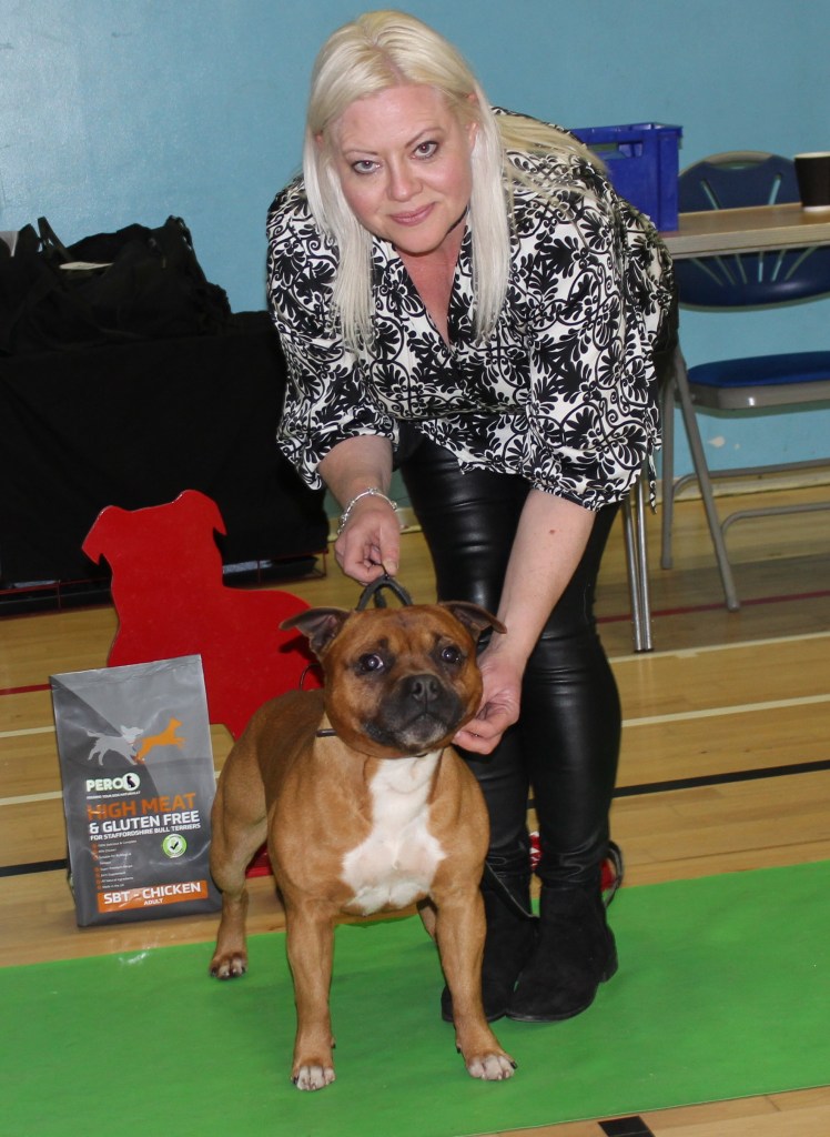 This young dog is everything I look for in a male Stafford he excels in so many departments, He is a cracking Stafford with so much to offer to the breed, Excellent head shape of quality with the most beautiful expression one that makes you look twice, The darkest of eyes,Good ear carriage, distinct stop with correct scissor bite,lovely depth to muzzle, pronounced cheek muscles, smart front with a good depth & width to brisket, good feet, He stood compact and four square showing off his excellent condition, good reach of neck leading down to well laid back shoulders, excellent spring of rib,well let down in hocks, well muscled sound backend, good amount of bone, He moves with drive and purpose exhibiting a good topline, Few words come to mind when i think of this dog, BREED TYPE.. POWERFUL…CRACKER… one I would love to own and a credit to his owners, He was a pleasure to judge and I was only too pleased to award him DCC.