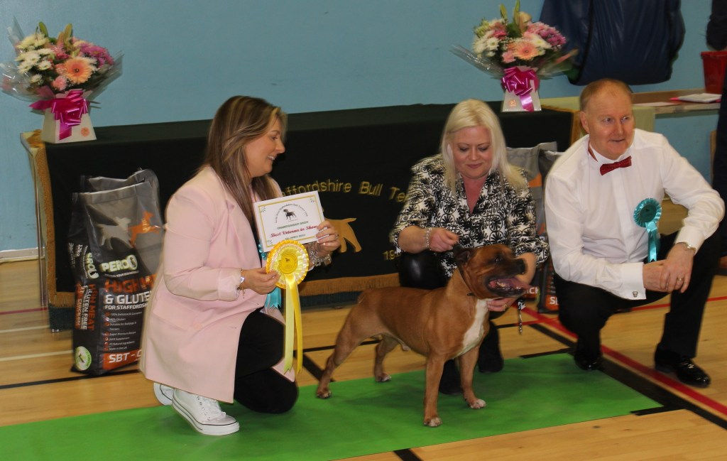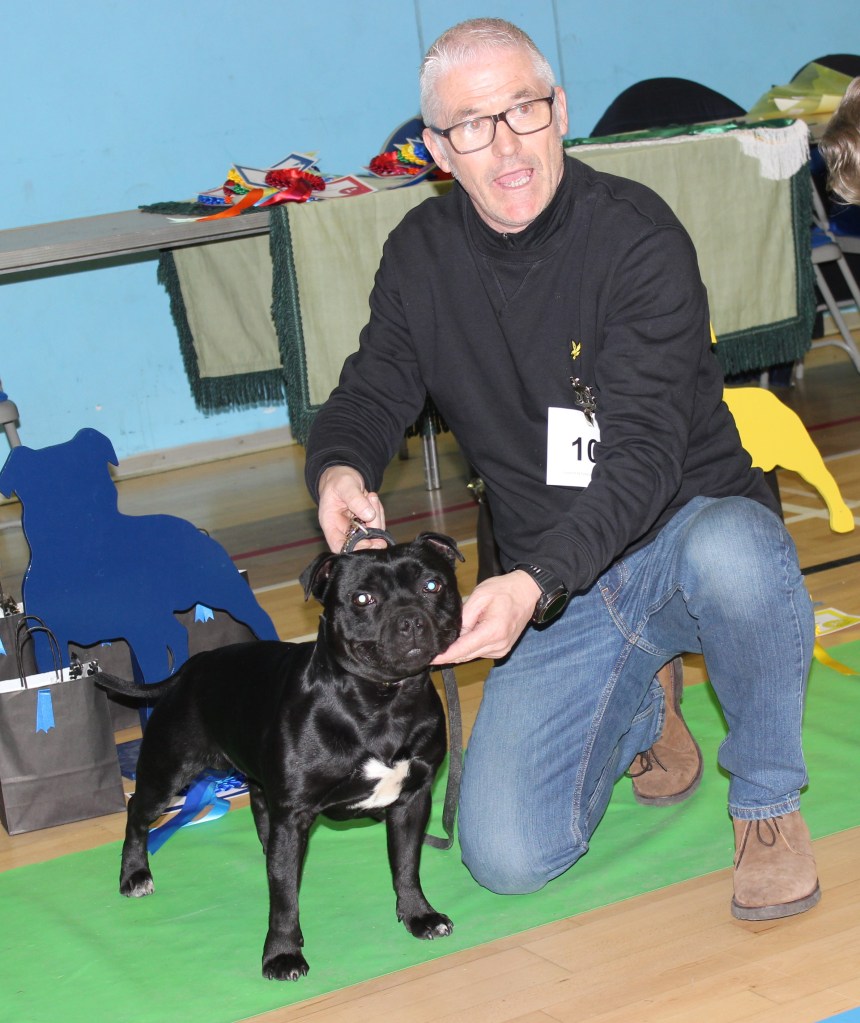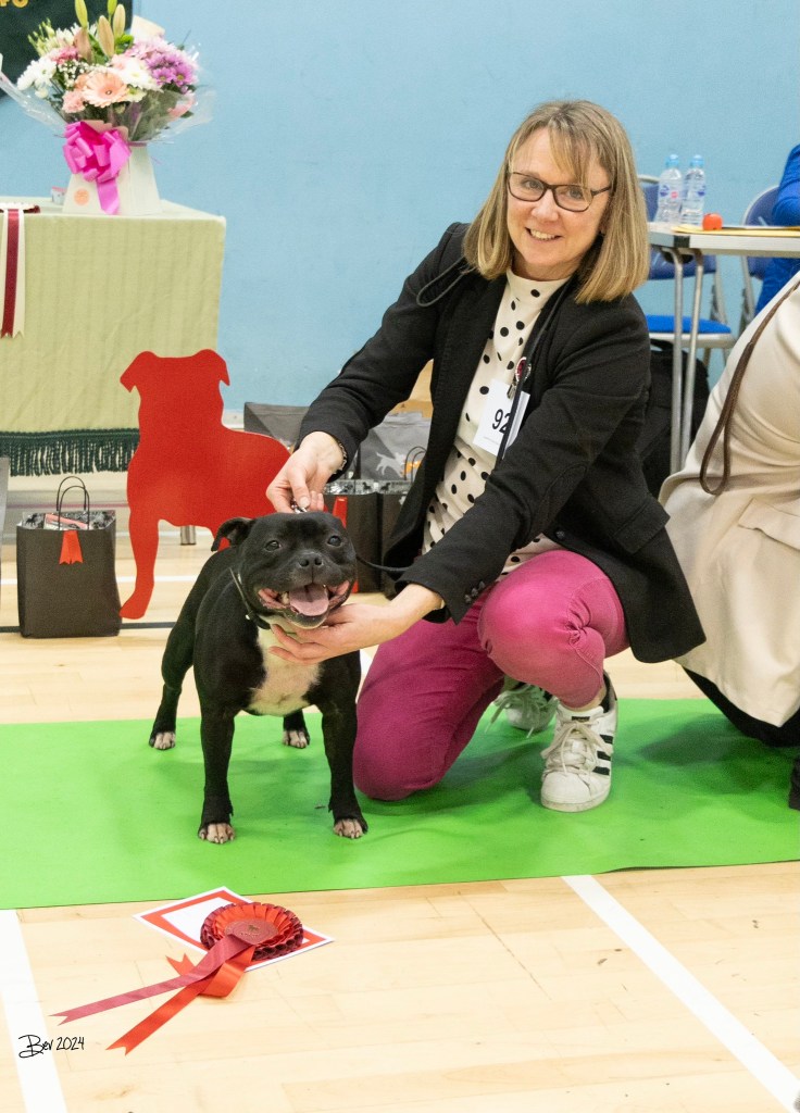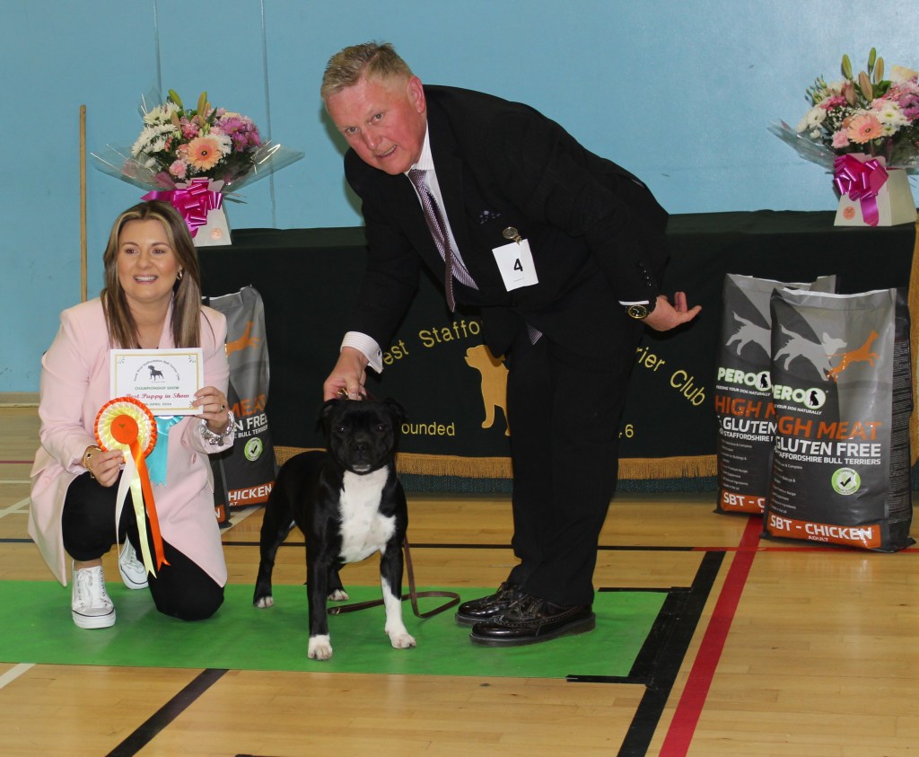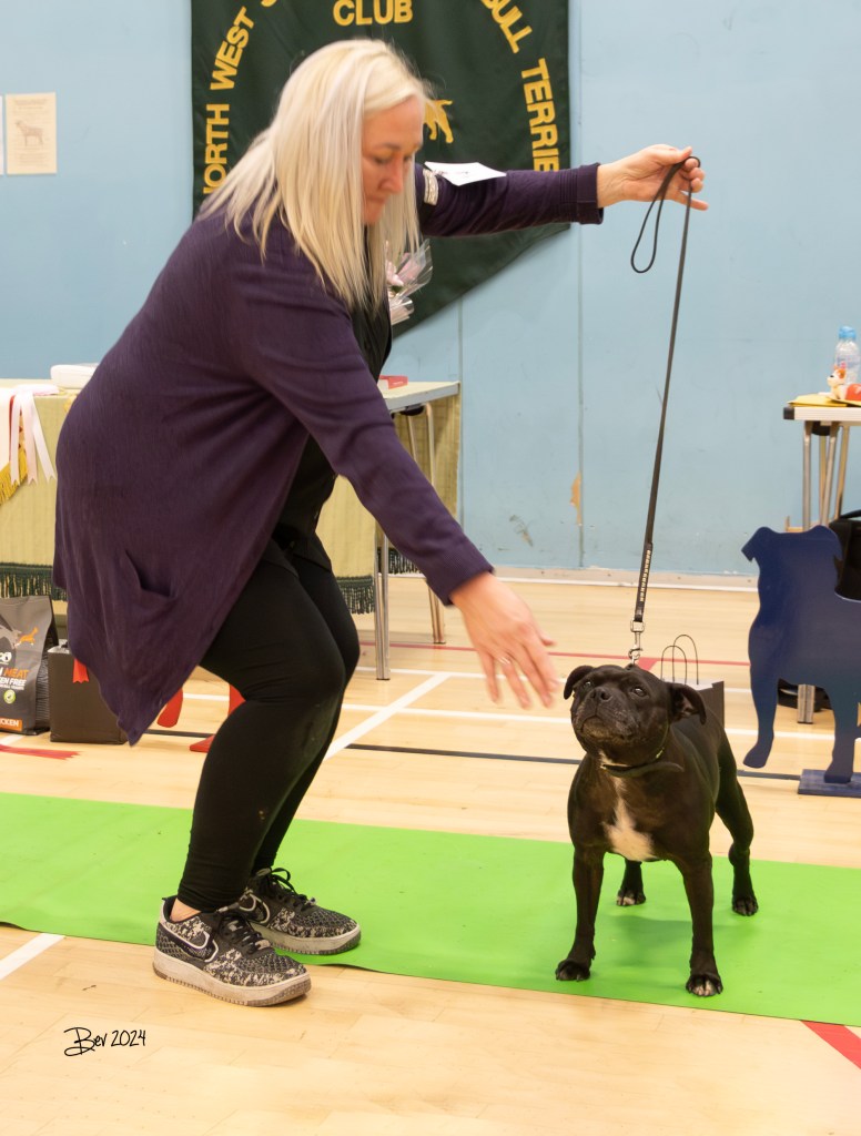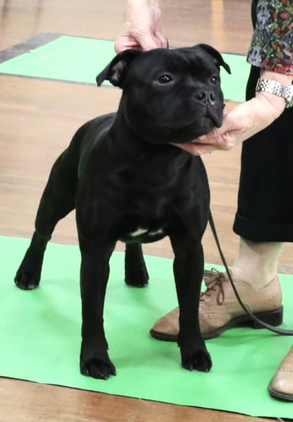 This young dog is everything I look for in a male Stafford he excels in so many departments, He is a cracking Stafford with so much to offer to the breed, Excellent head shape of quality with the most beautiful expression one that makes you look twice, The darkest of eyes,Good ear carriage, distinct stop with correct scissor bite,lovely depth to muzzle, pronounced cheek muscles, smart front with a good depth & width to brisket, good feet, He stood compact and four square showing off his excellent condition, good reach of neck leading down to well laid back shoulders, excellent spring of rib,well let down in hocks, well muscled sound backend, good amount of bone, He moves with drive and purpose exhibiting a good topline, Few words come to mind when i think of this dog, BREED TYPE.. POWERFUL…CRACKER… one I would love to own and a credit to his owners, He was a pleasure to judge and I was only too pleased to award him DCC.
