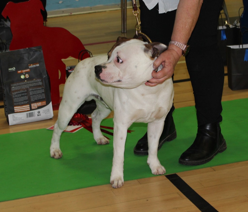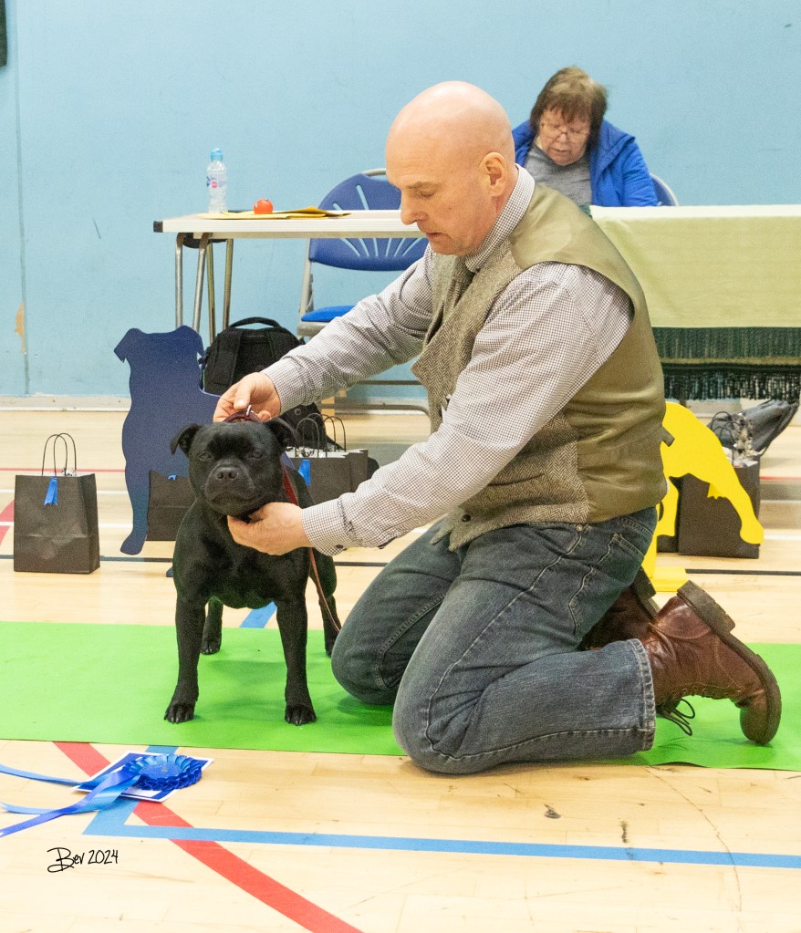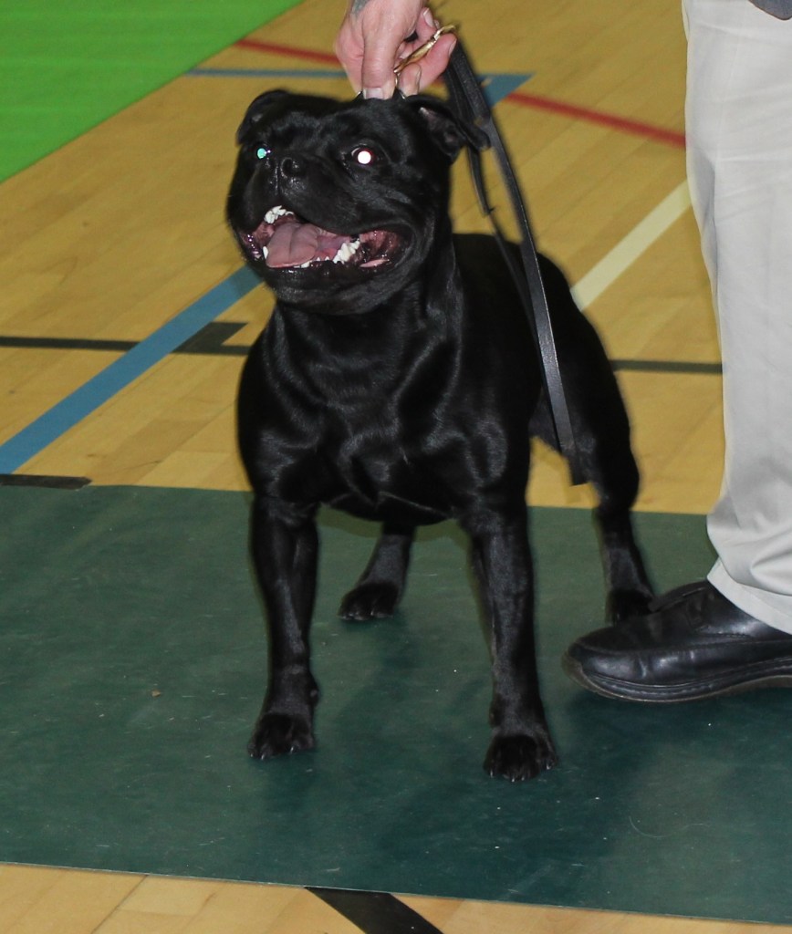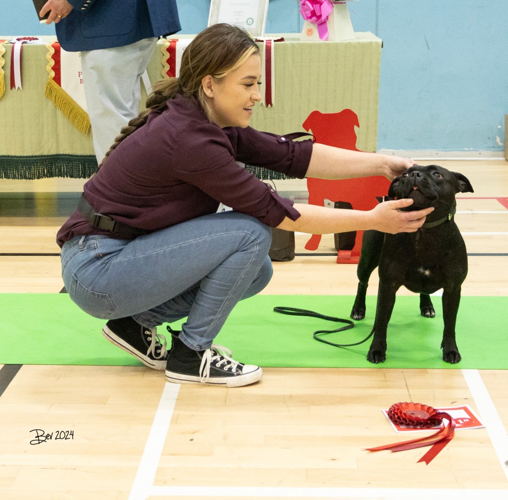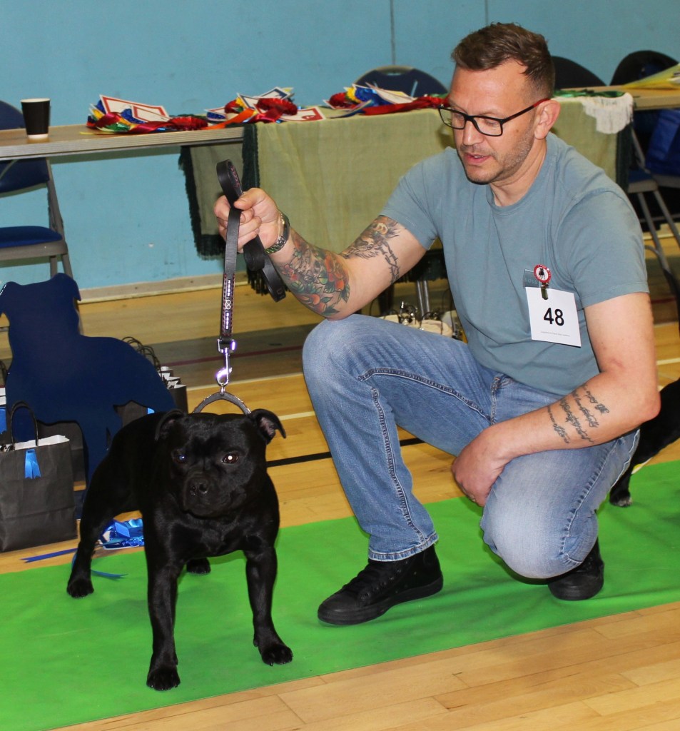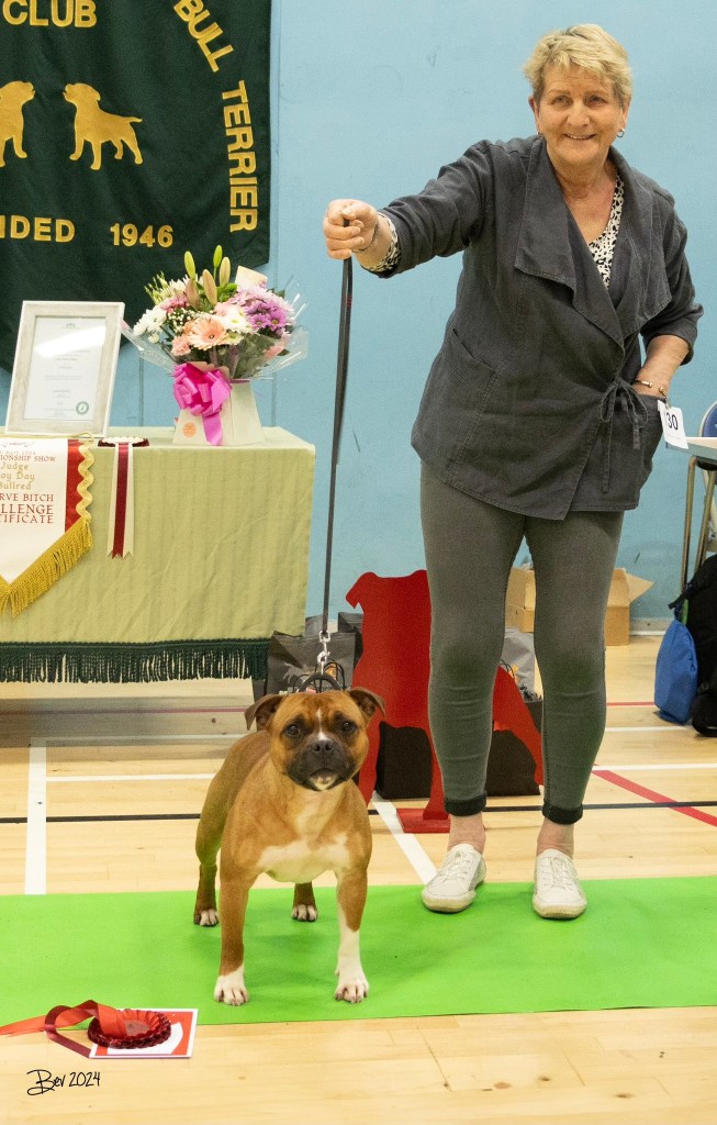 This young dog is everything I look for in a male Stafford he excels in so many departments, He is a cracking Stafford with so much to offer to the breed, Excellent head shape of quality with the most beautiful expression one that makes you look twice, The darkest of eyes,Good ear carriage, distinct stop with correct scissor bite,lovely depth to muzzle, pronounced cheek muscles, smart front with a good depth & width to brisket, good feet, He stood compact and four square showing off his excellent condition, good reach of neck leading down to well laid back shoulders, excellent spring of rib,well let down in hocks, well muscled sound backend, good amount of bone, He moves with drive and purpose exhibiting a good topline, Few words come to mind when i think of this dog, BREED TYPE.. POWERFUL…CRACKER… one I would love to own and a credit to his owners, He was a pleasure to judge and I was only too pleased to award him DCC.