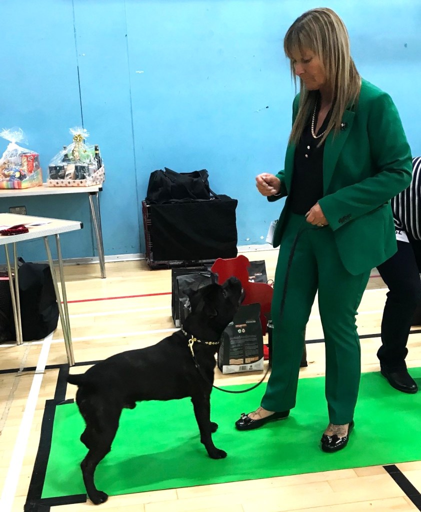 Black brindle of super quality ,she did grow on me once I had gone over her. Great strength and size and lovely balance. Typical head shape creating a keen expression with neat ears and dark eye, strong yet clean muzzle. A bit more up on the leg than first but still good width and depth to her front and substance to match. Ample spring of rib and close coupled with level topline. Great strength to her well angulated rear with enough width to match.moved and handled expertly by her handler. Thank you and well done.