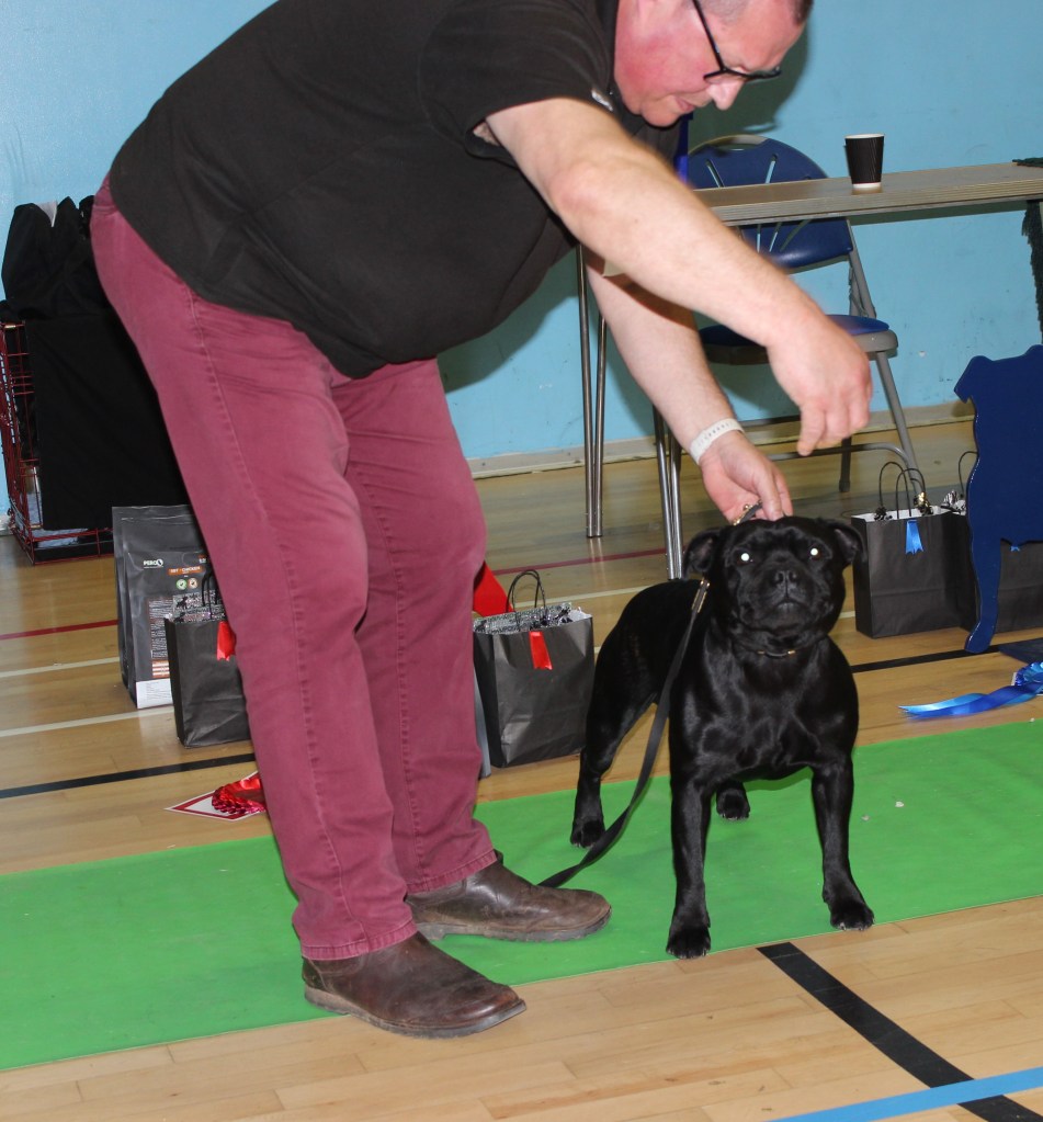 Black brindle who shows good breed type seen in her keen expression.this from a good head shape of correct proportions,neat ears and nice dark eye.straight front which has enough substance and depth at this stage.level topline.she is close coupled with good spring of rib and has correct rear angulations,this showed in her movement both for and aft. Just preferred the width of front and strength in the back end of winner. Handled expertly with ease.Thank you and well done.