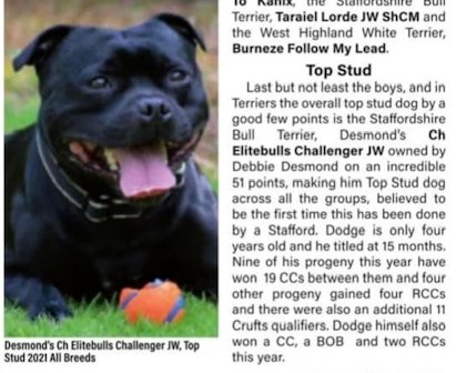 NW Members Debbie & Alan Desmond’s Ch Elitebulls Challenger (Dodge) has hit new heights – he is the Our Dogs 2021 Top Stud dog – All Breeds – what an achievement and congratulations – see extract below. (what is not mentioned is that three of the nine CC winners are Champions).