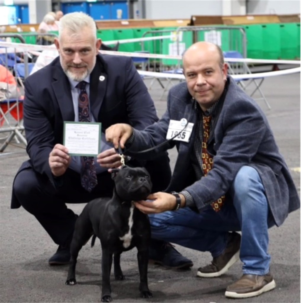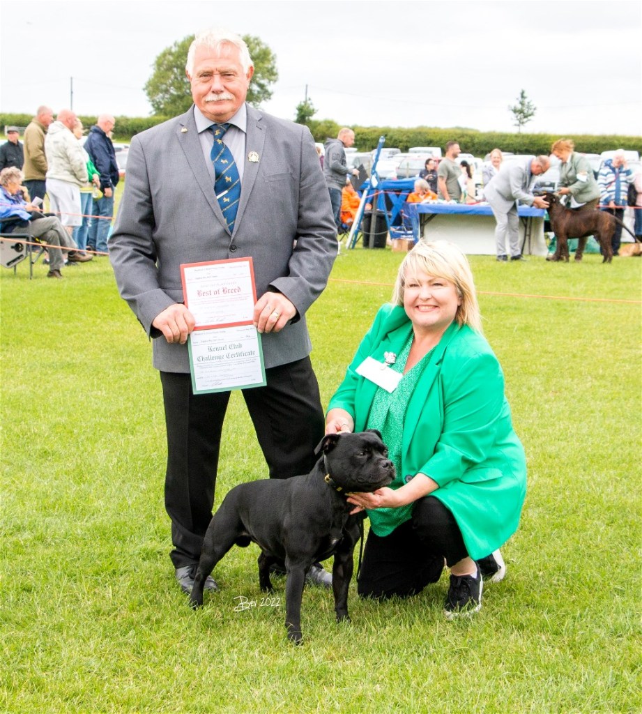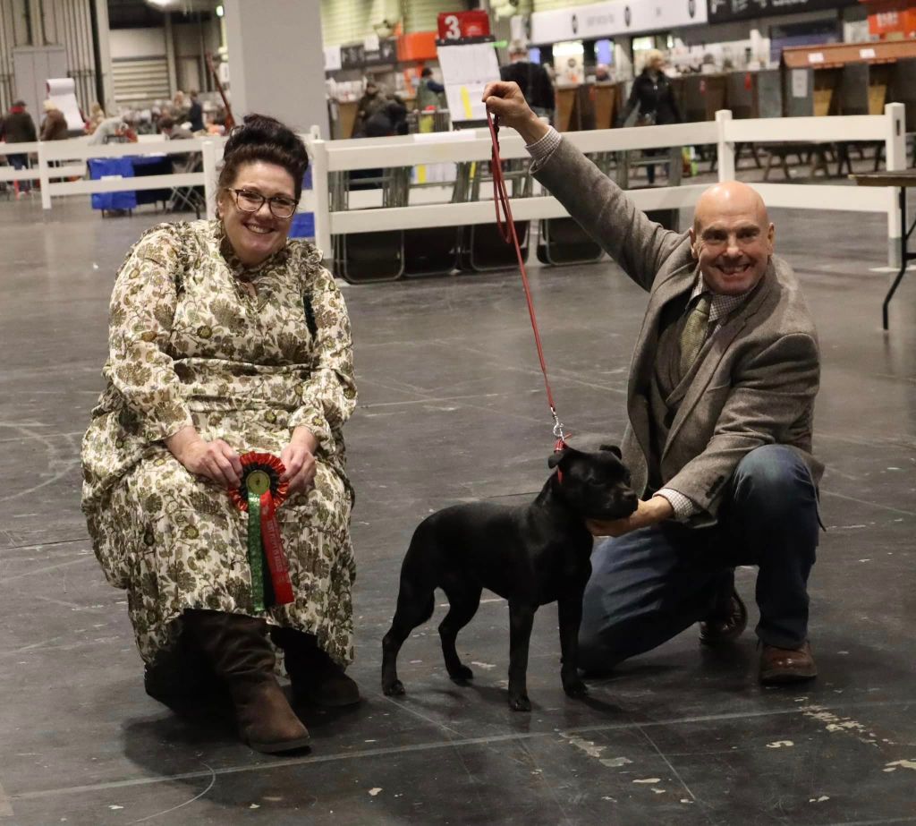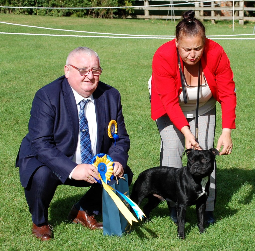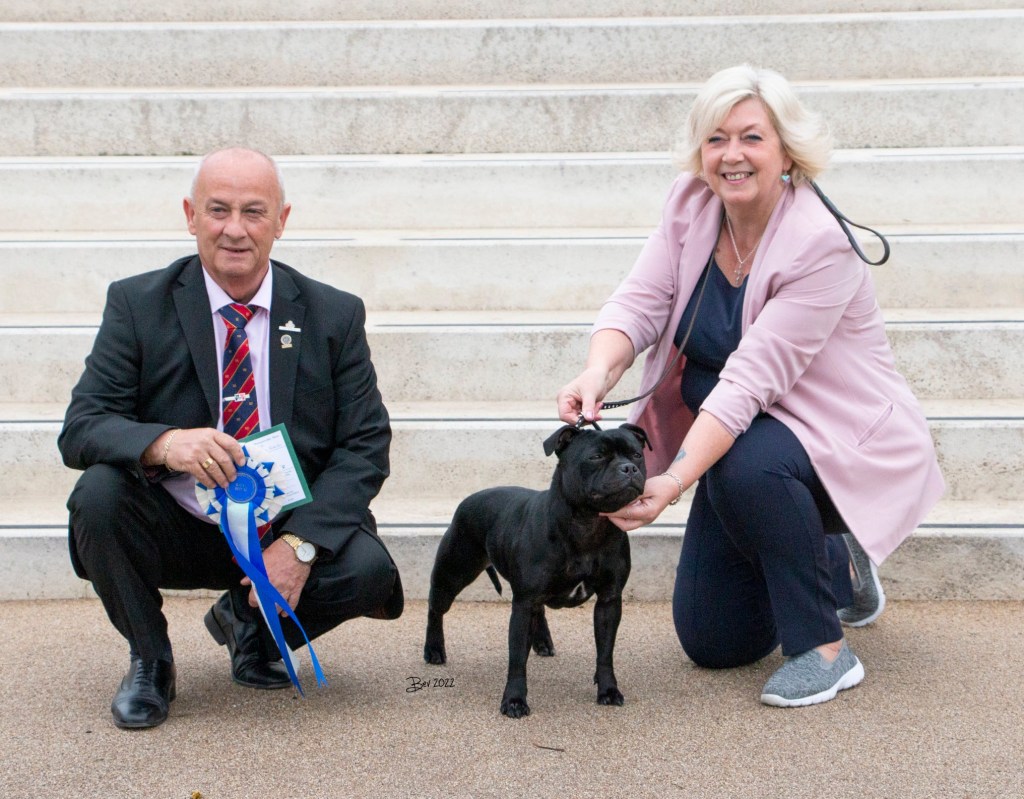 The second NW member(s) (and NW committee members as well) to receive that coveted third CC in 2022 are John & Chrissy Howard with their home bred bitch Matrixstaffs Black Beauty – this was awarded at the second Notts & Derby show under Laureen Williams. This bitch is out of the Howard’s first litter, mating their bitch Caymenstaffs Little Minx to the Allsopp’s Ch Rubericla Trailbreaker. Chrissy had regained her composure by the time this photo (above) was taken