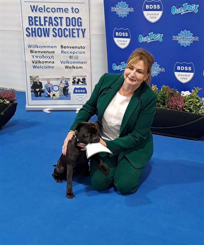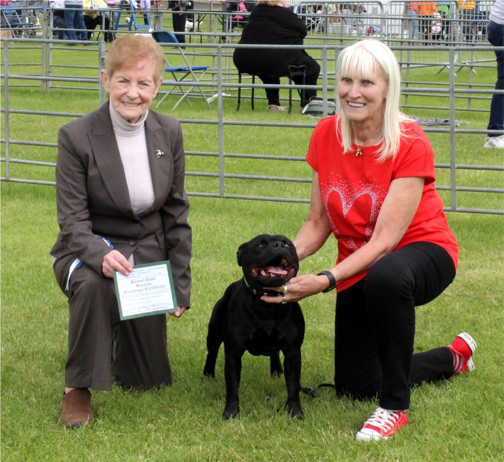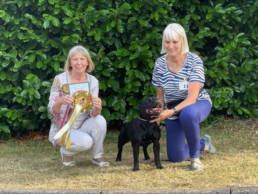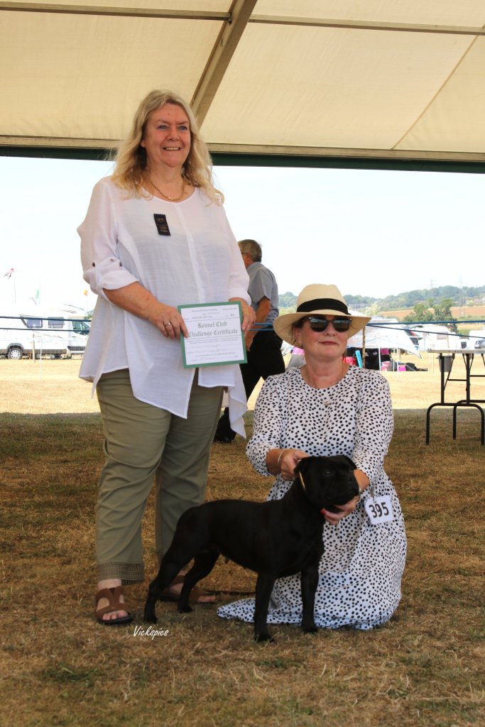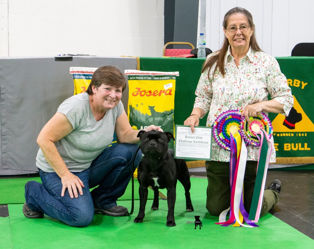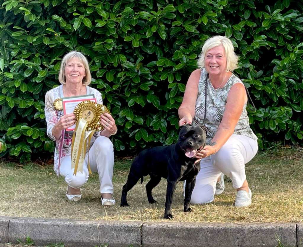 The second NW member(s) (and NW committee members as well) to receive that coveted third CC in 2022 are John & Chrissy Howard with their home bred bitch Matrixstaffs Black Beauty – this was awarded at the second Notts & Derby show under Laureen Williams. This bitch is out of the Howard’s first litter, mating their bitch Caymenstaffs Little Minx to the Allsopp’s Ch Rubericla Trailbreaker. Chrissy had regained her composure by the time this photo (above) was taken