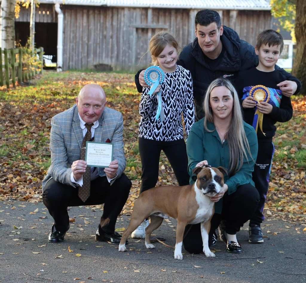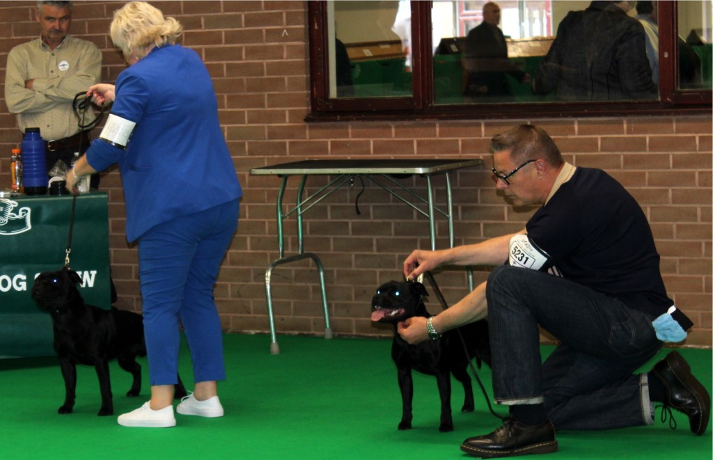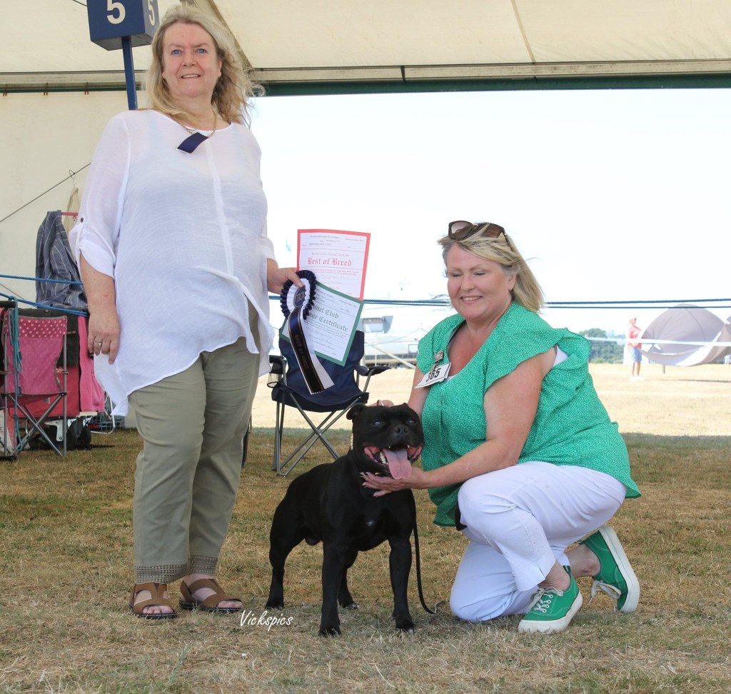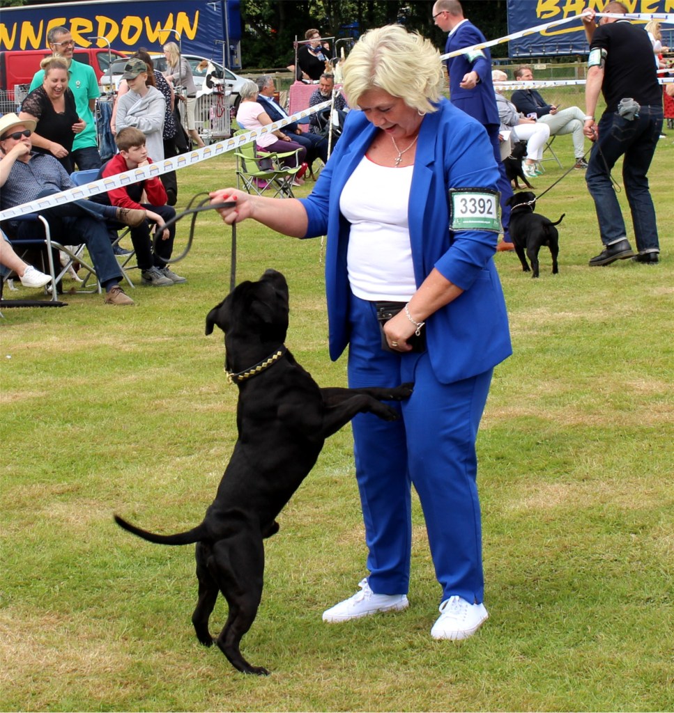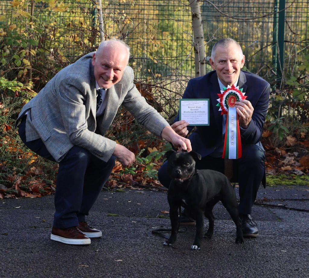 The second NW member(s) (and NW committee members as well) to receive that coveted third CC in 2022 are John & Chrissy Howard with their home bred bitch Matrixstaffs Black Beauty – this was awarded at the second Notts & Derby show under Laureen Williams. This bitch is out of the Howard’s first litter, mating their bitch Caymenstaffs Little Minx to the Allsopp’s Ch Rubericla Trailbreaker. Chrissy had regained her composure by the time this photo (above) was taken
