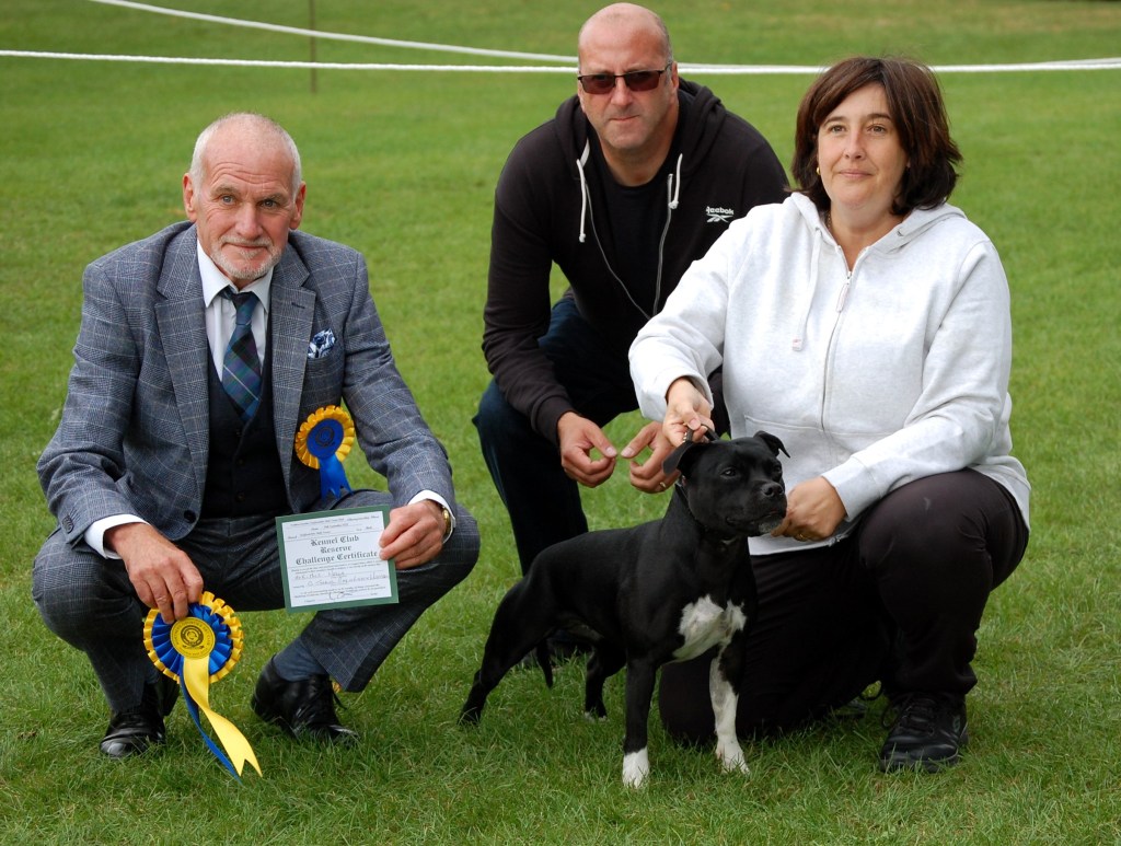 Dogs from these two kennels took both CC’s with the DCC going to Jackabyte Boletoro at Nettleworth (his first) and the BCC to Elitebull Mojito at Nettleworth (her third and she went BOB). Both these Staffords are by Ch Elitebulls Challenger, currently the top Stud dog and are owned by John & Sam Parker. The photo below is of the BOB challenge, not a brilliant one I’m afraid.