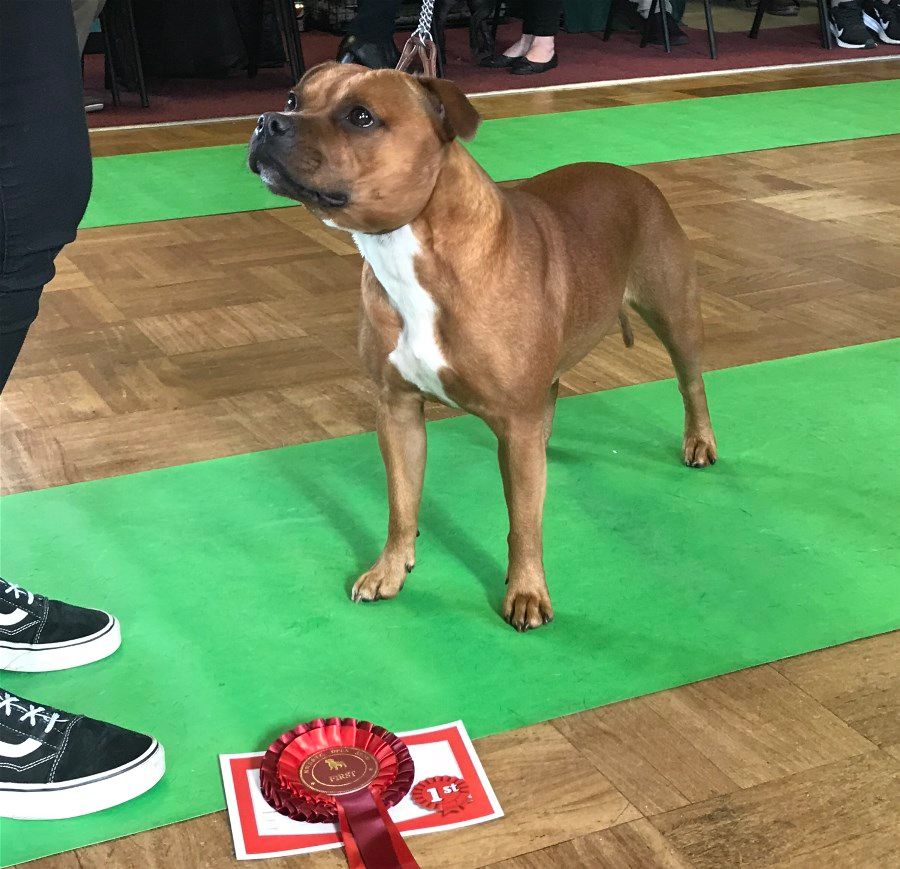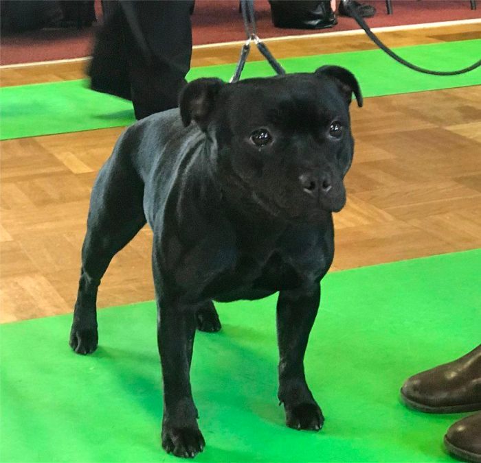 Beautiful brindle colour Another top quality dog with a good head dark eyes and neat ears strong underjaw. Lots of bone good wide front with good deep chest and well sprung ribs. Strong neck running into well angulated powerful shoulders. Level top line and strong rear quarters with correct tail set and nice bend of stifle. Moved well. Reserve Best Dog.