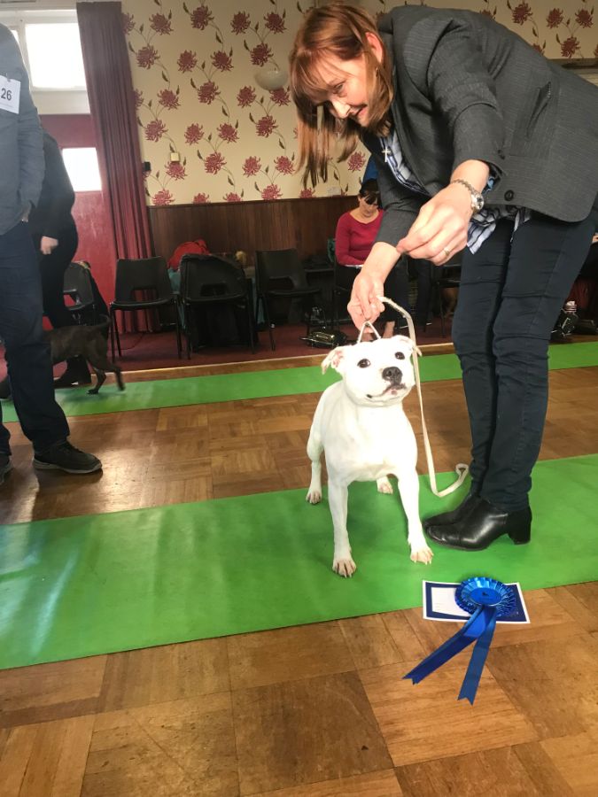 White bitch with a strong head neat ears dark eye. Strong neck running into well angulated shoulders good wide front with good depth of chest and enough rib. Level top line powerful rear quarters moved well. Another quality bitch just preferred the balance of 1st.