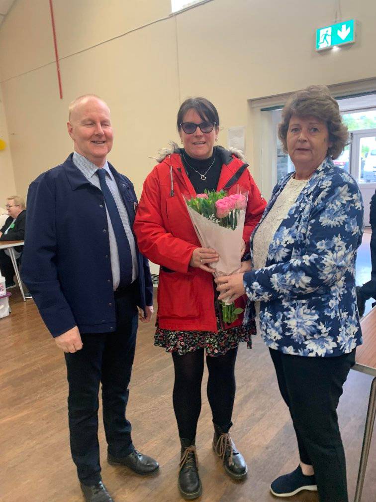 Apologies for the sparsity of the show report – the Norton’s were absent from this event – medical issues that have blighted us for most of this year. As for photos, Claire took a considerable number of shots of people around the show (which was commendable) – all except one that were hazy in the extreme – it looked like the venue was fog bound. The one remaining one is of the Chairman, Roy Day and Claire presenting the venue manager with a token of our thanks – below.
