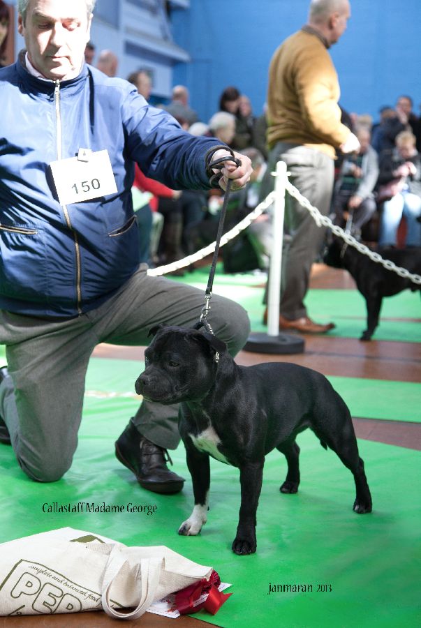 2nd. MILNER`S, I LUV STAFFIES VIVA LA DIVA. White with red patch over right eye, classic head shape, deep stop, correct bite, good front, good deep brisket and spring of rib, good backend, moved well. 3rd. Glassbrook & Rhodes Cannichbull Capercaillie. Black/brindle, good shaped head, dark eye, short neck, level topline , good rear end, moved ok.