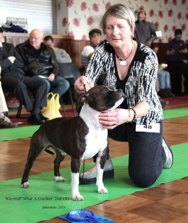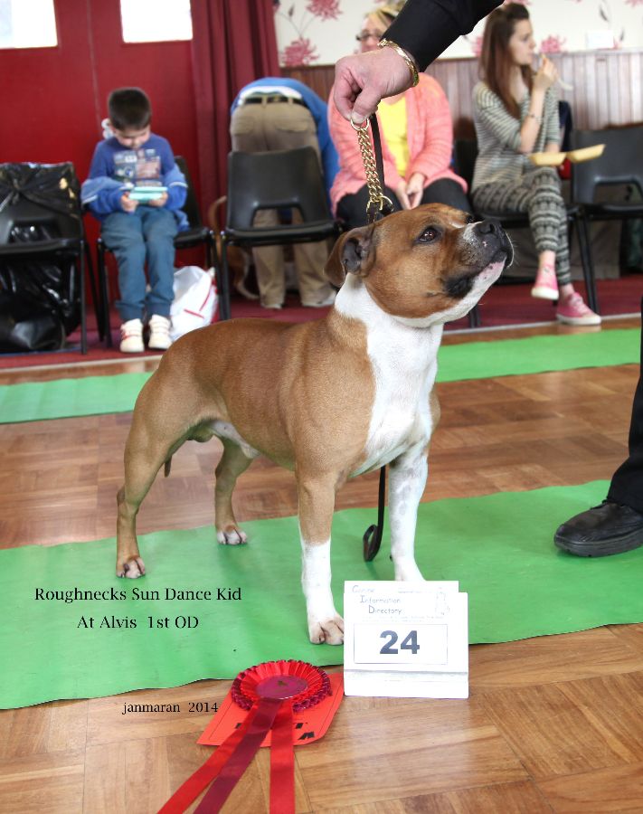 Fergiestaffs Olympic Flame; red and white with pleasing head shape, dark eye, neat ears. Good top line moved ok. Just preferred the front on my 1st place.