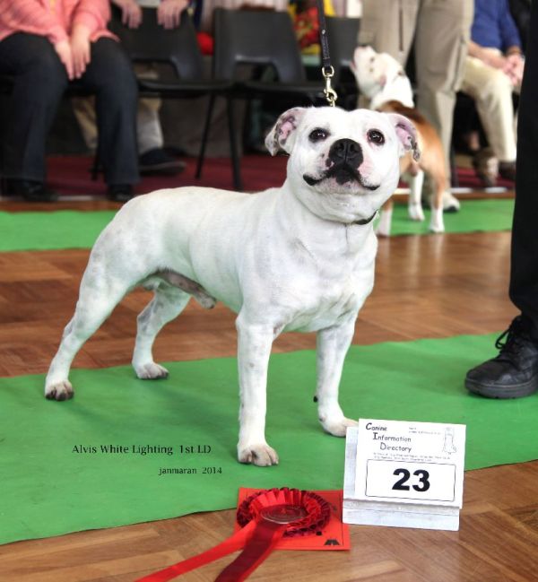 Alvis White Lighting. All white dog with good pigmentation, strong deep head tidy ears, dark eyes, strong neck which led into good angled shoulders, good top line nice tuck up in loin. Short in the back. Powerful rear end, moved well. Just lost a bit of interest in final line up which lost him RBD.