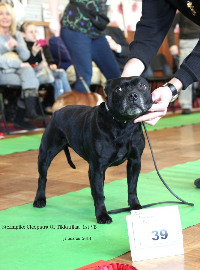 Stormpike Cleopatra of Tikkurilan. 11yr old black brindle deep through head, dark eye, neat ears good front, level top line, nice spring of rib. Little tuck up in loin, nice rear quarters moved ok, in good condition.
