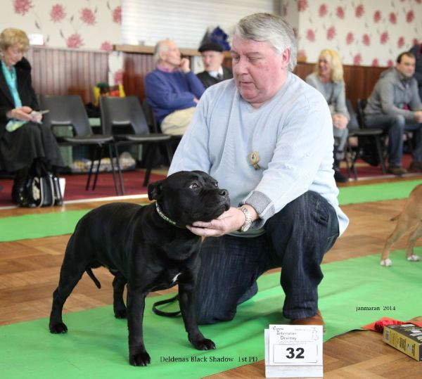 Deldenas Black Shadow 10mth Black Brindle that fits the standard, nice deep skull dark well placed eye, neat ears when he put them up. Good angle on front and rear. Top line ok on the move, but a little ring shy which let him down on the final line up.