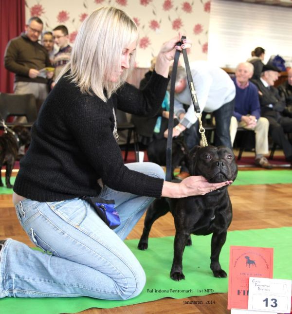 Ballindona Benromach Black Brindle of nearly 9 mths nice shaped head with a good mouth. Dark Eye and neat ears, straight front, good feet that were turned down nicely. Good Top line, bend of stifle and moved well. BPD+BPIS. A good future ahead for this boy.