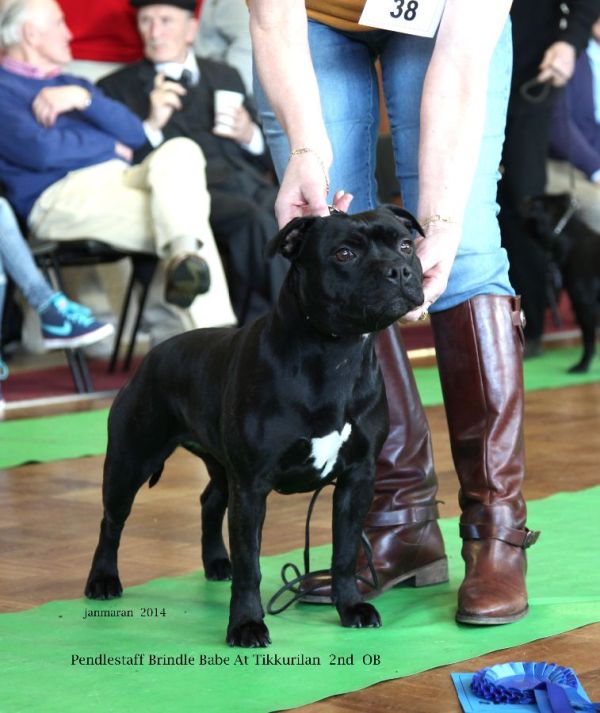 Eclypstaff C’est La Vie avec Tikkurilan. Top size black brindle with nice head shape deep stop. Good mouth tight lips, good ears and eyes. Well off for bone in front with nice feet, good angulation front and rear. Good movement and level top line.
