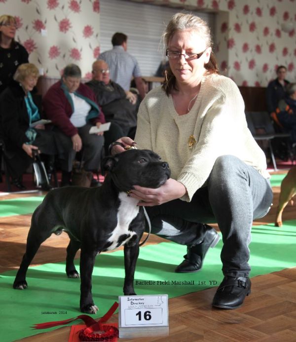 Barielle Field Marshall; Black brindle with white, nice clean head shape, round eyes, mouth ok, good length of neck, straight front with good shoulders. Level top line which is kept on the move, nice turn of stifle, little erratic on the move.
