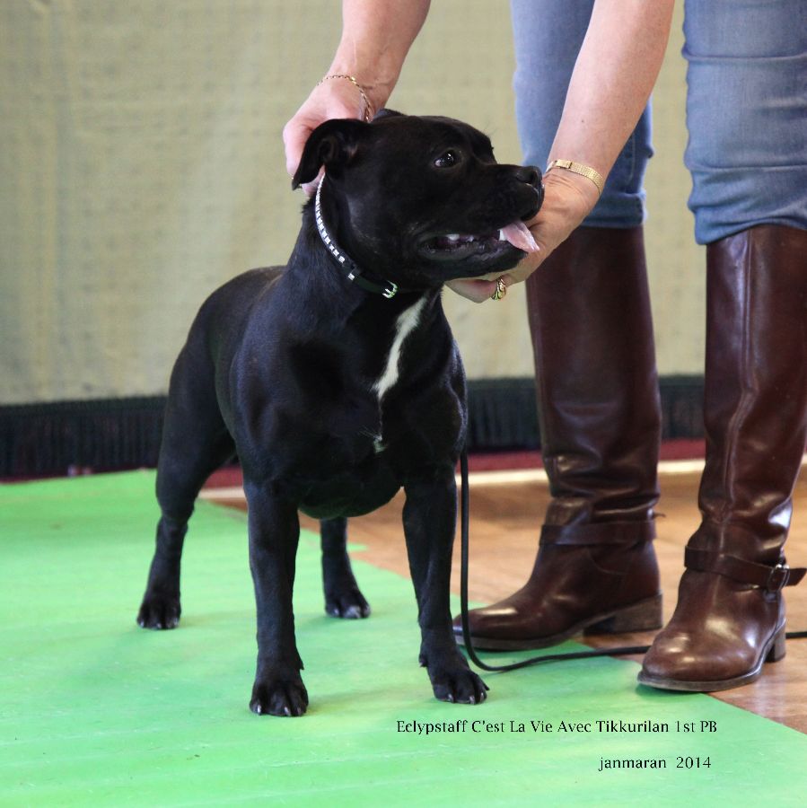 Eclypstaff C’est La Vie avec Tikkurilan. Top size black brindle with nice head shape deep stop. Good mouth tight lips, good ears and eyes. Well off for bone in front with nice feet, good angulation front and rear. Good movement and level top line.