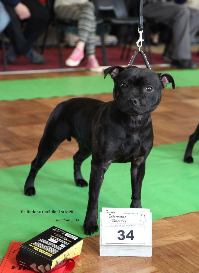 Ballindona Benromach Black Brindle of nearly 9 mths nice shaped head with a good mouth. Dark Eye and neat ears, straight front, good feet that were turned down nicely. Good Top line, bend of stifle and moved well. BPD+BPIS. A good future ahead for this boy.