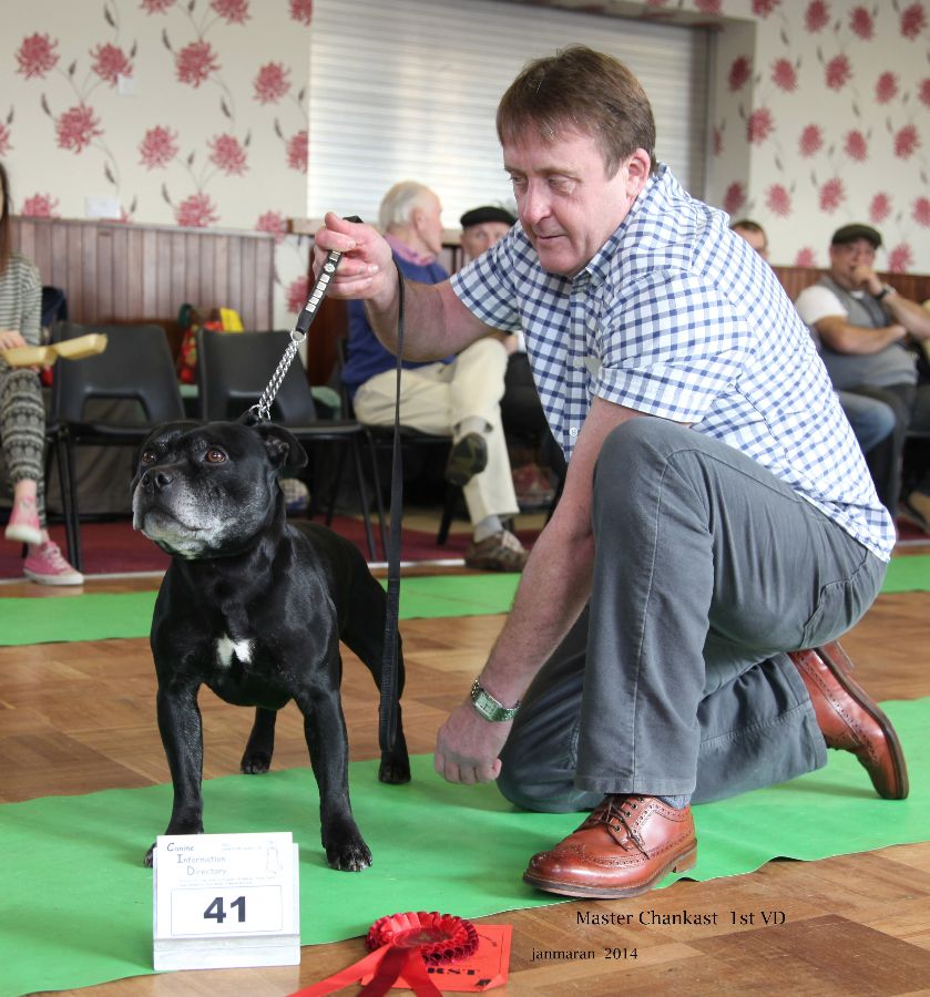 Master Chankast. Stood alone but nice black brindle and white. Kept his head shape for age, neat ears, round eye, straight front, good top line certainly enjoyed his day out.