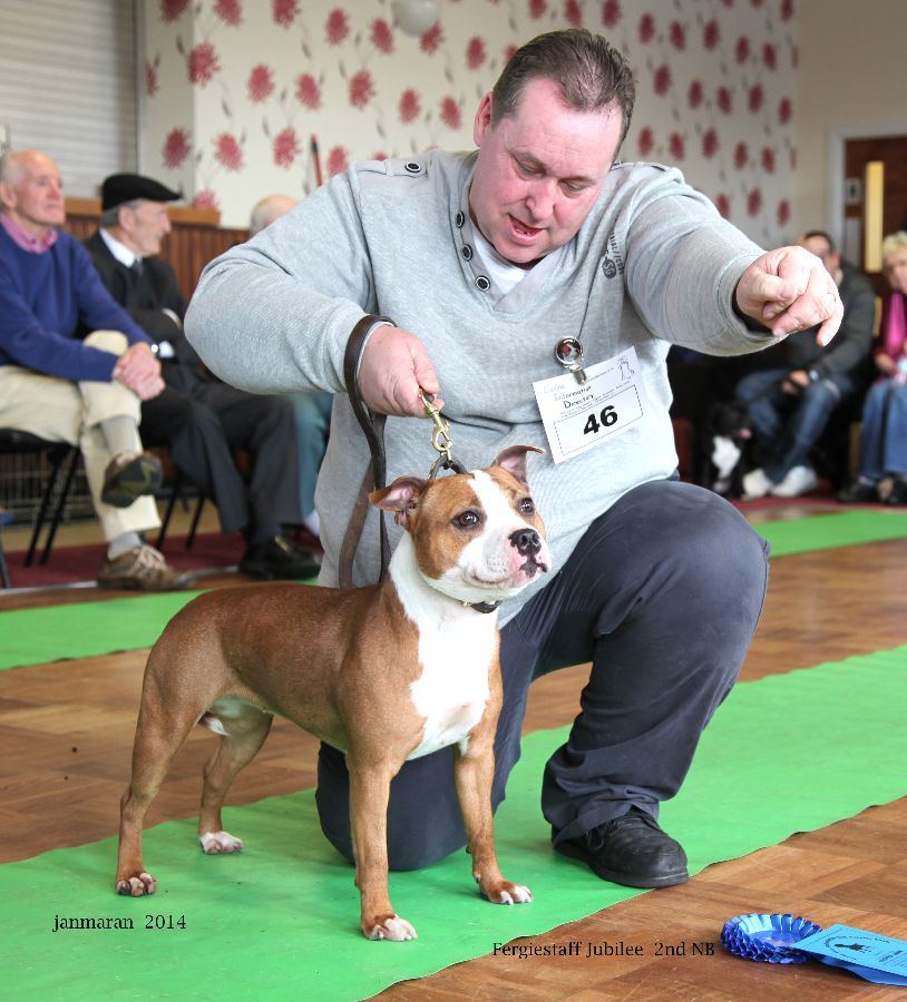Fergiestaff Jubilee, nice standard bitch 3rd in yearling, clean head, good bite correct front, ample rib, stifle ok, moved well, let down by her ears.