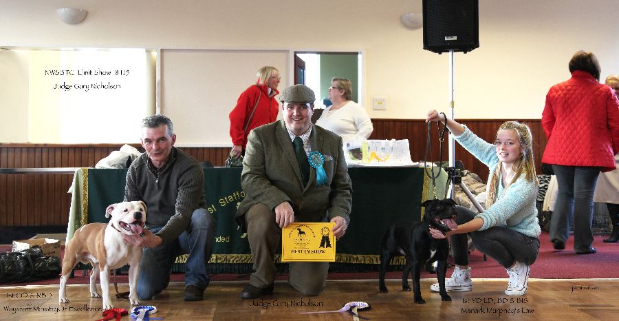1. Mr P T & Mrs E A Stanway CRASHKON PUSSYCAT DOLL Black/brindlebitch I fell in love with an expression to die for, she is the shortest Stafford I have ever had the pleasure of going over, lovely head, good front, tightest of feet, well ribbed, extra short coupled, ok backend, nice and fit for age too. Stood like the professional she is. Moved and handled very well.
