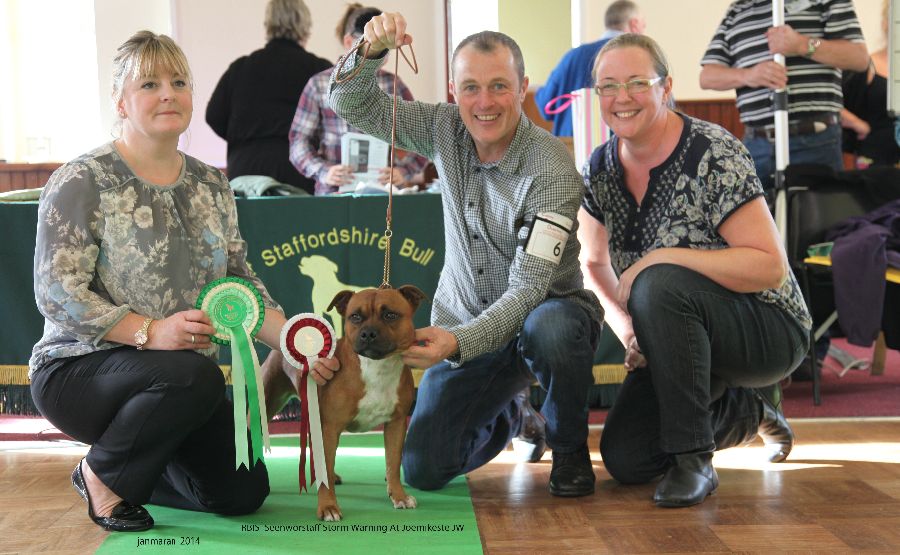 1. BUTLER’s – SEENWORSTAFF STORM WARNING AT JOEMIKESTE JW – Red/wht chest. Caught my eye when she entered the ring. Cracking head shape on her, deep broad but still very feminine, pronounced cheek bumps, eyes dark and round, tidy ears helping to give her a lovely expression. Good teeth house in strong jaws. Good front, well boned good pasterns, brisket ok and well sprung ribs, short coupled and level topline. Great back end, she had proper thighs, well-muscled. Nice tail carriage and moved well. A very nice looking girl, a pleasure to go over. RBB & RBIS