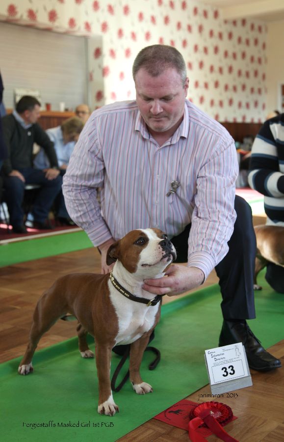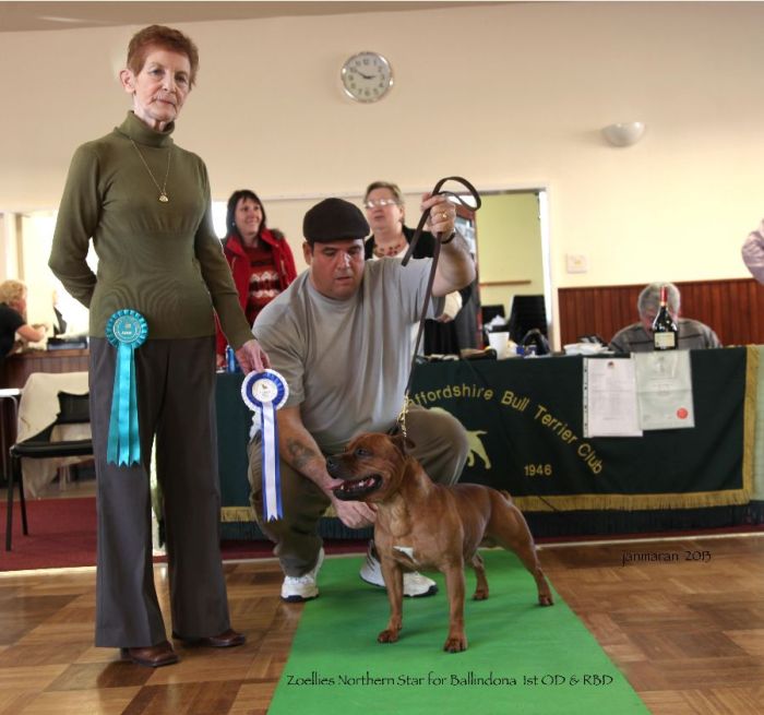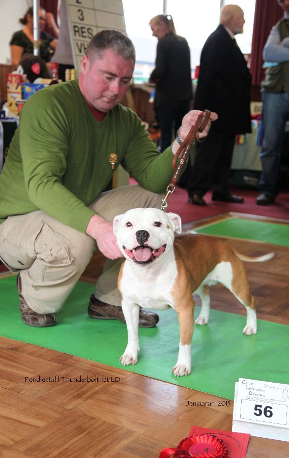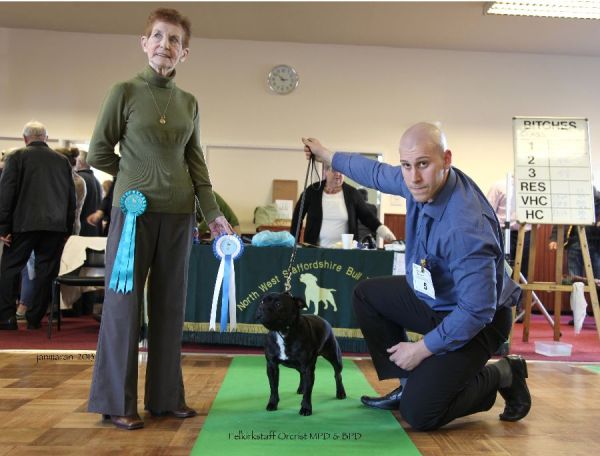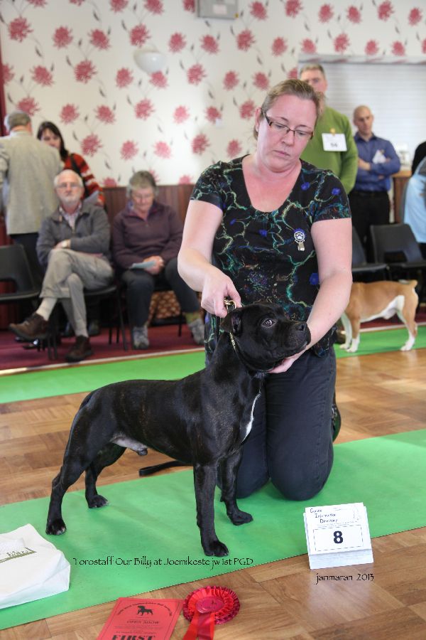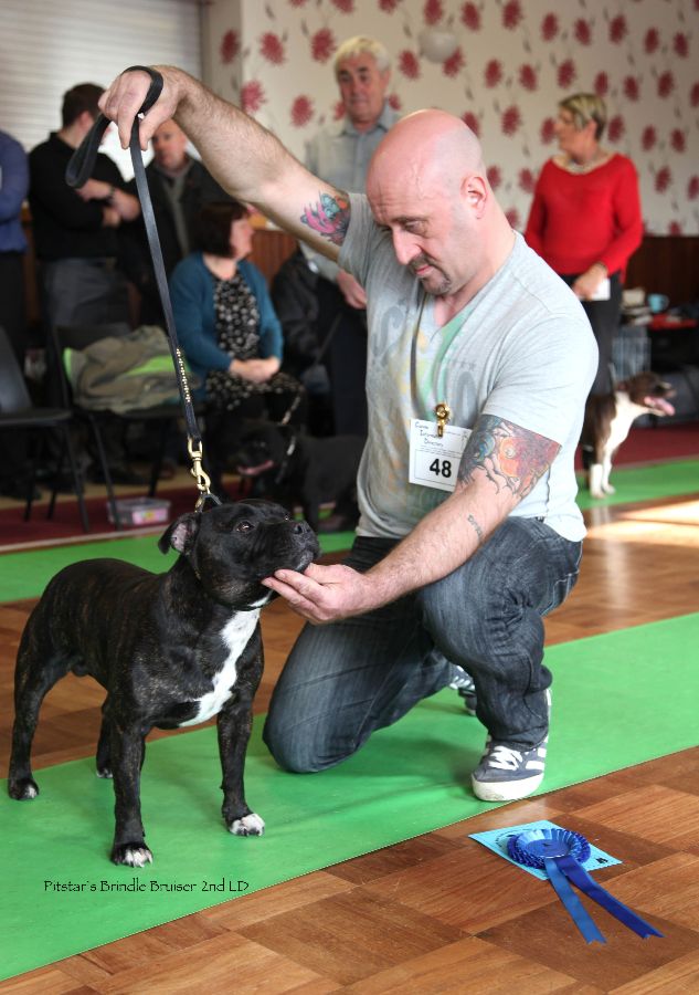 2 Payne’s, Pitstars Brindle Bruiser, typey b/d shapely head distinct stop, good bite with big teeth well set ears white feet and chest good bend of stifle moved well.