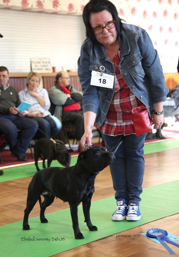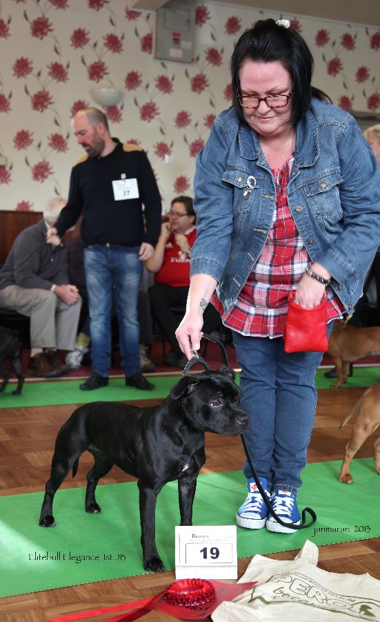 JB1 Desmond’s Elitebull Elegance, b/br, shapely head nothing overdone dark eye, neat ears carriage, good bite, keen expression, straight front, good depth of brisket, well sprung rib, nice tuck up, level top line, well bent stifle moved well.