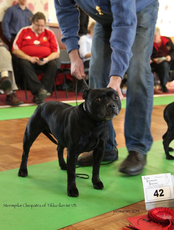 VB. 1 Norton’sStormpike Cleopatra of Tikkurilan, b/br, 11yrs not showing her age except little white on muzzle. Lovely head dark eye tidy ears good bite teeth still white straight front moved well a credit to owners.