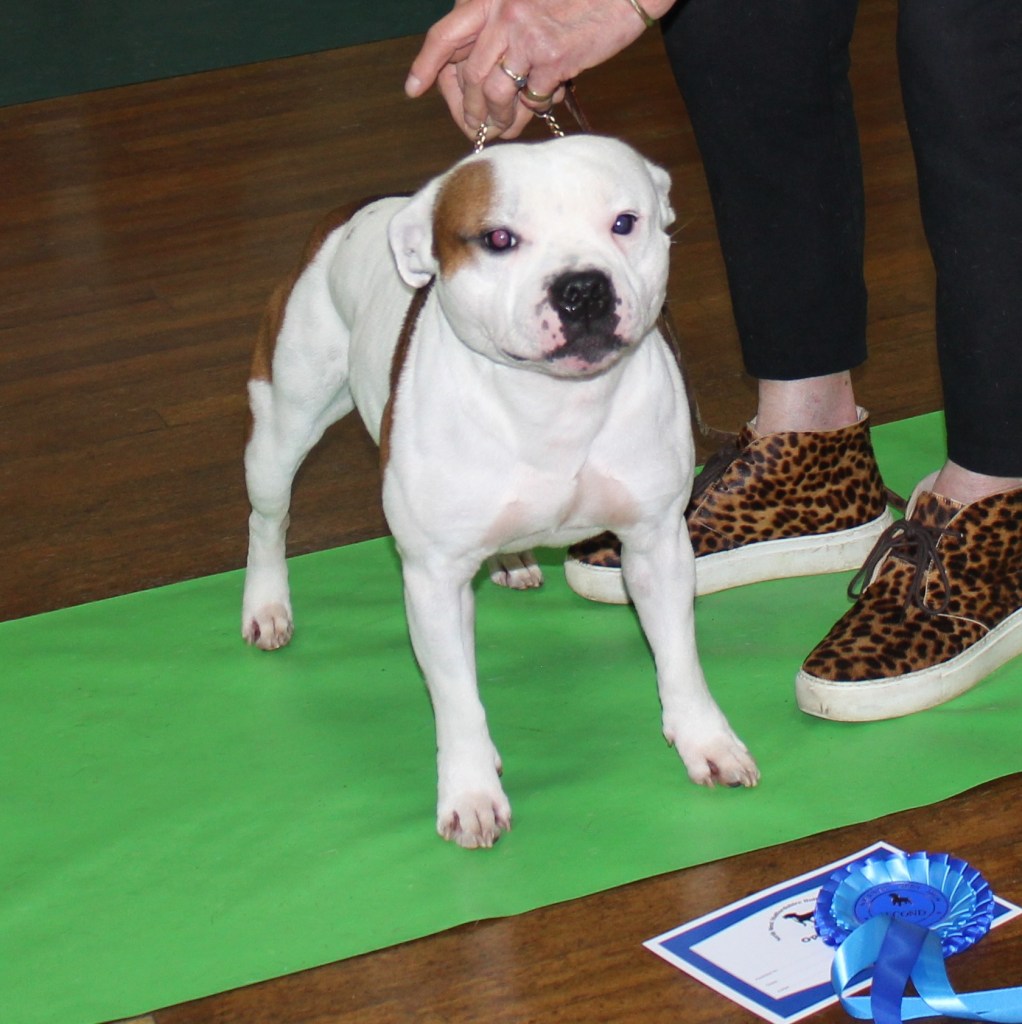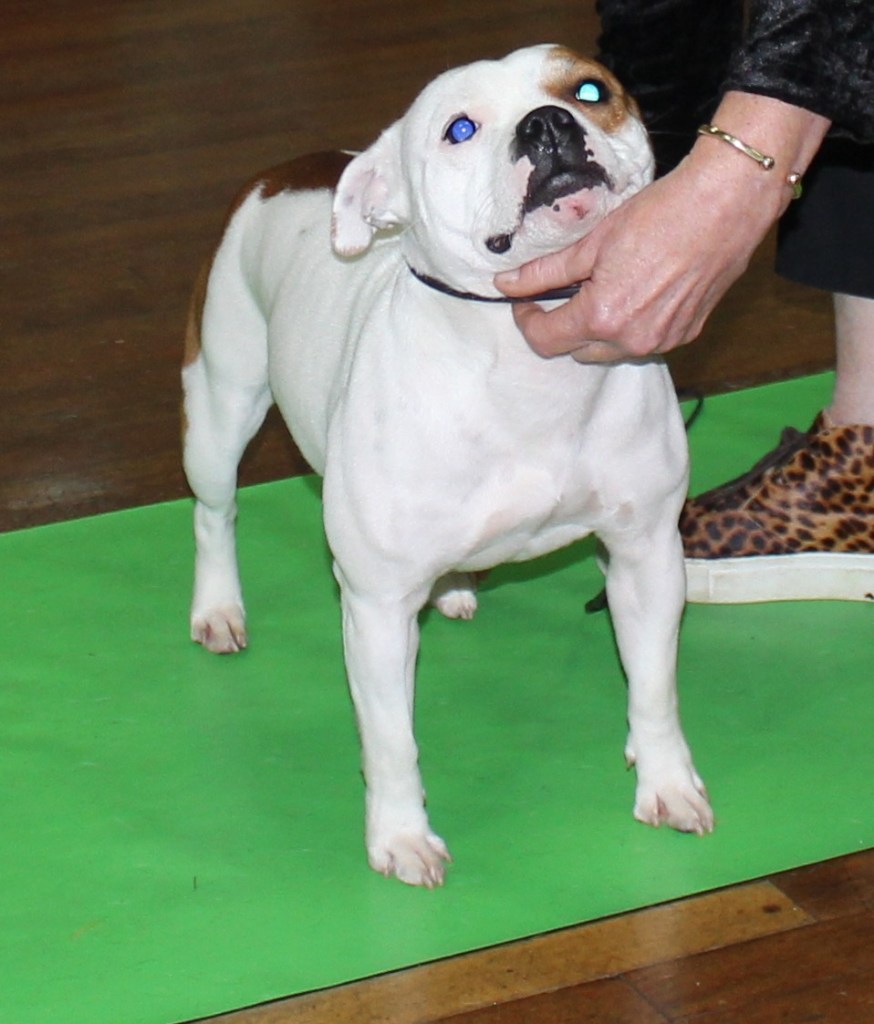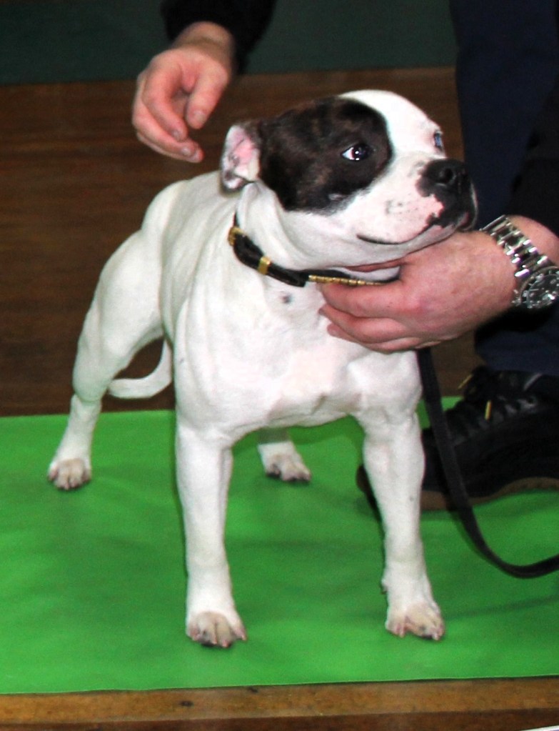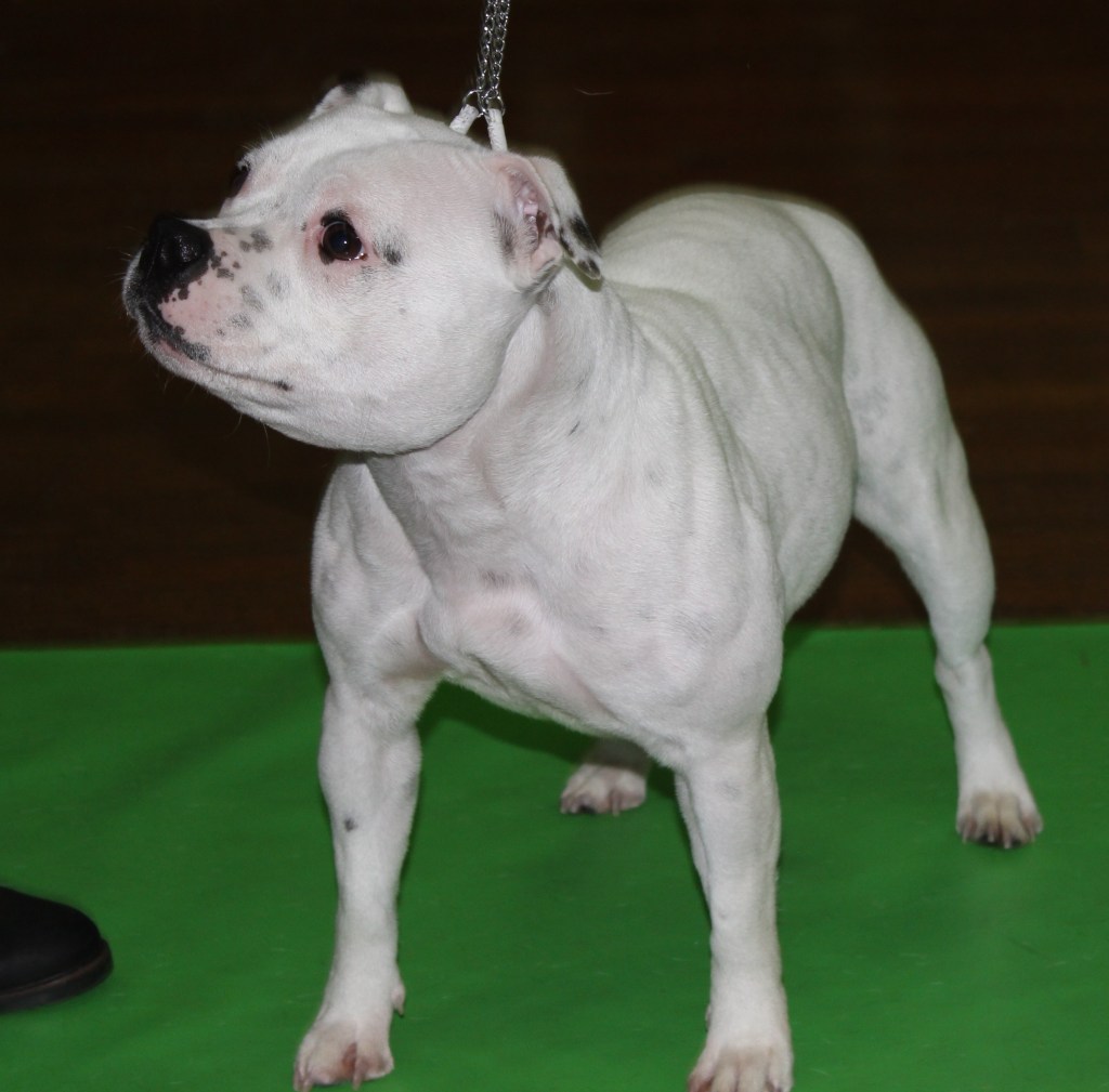 White bitch, lovely, balanced, fit, excellent tone and condition. Head short with broad skull, distinct stop, enough length to muzzle. Dark round eyes, neat rose ears. Lips tight and clean. Neck short and muscular, widening towards shoulders. Shoulders well laid back with no looseness at elbows. Wide front, well-sprung ribs, close-coupled body, level topline. Well-muscled hindquarters, hocks well let down. Moved and handled well. Preferred first for overall conformation.