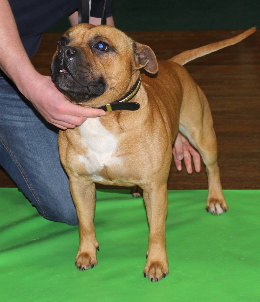Stunning red dog. Head short with distinct stop, pronounced cheek muscles, dark eyes, and rose ears framing an expressive head. Lips tight and clean with correct bite. Muscular neck into well-laid-back shoulders. Straight, well-boned legs, enough depth to chest, well-sprung ribs. Wide front, close-coupled, topline level standing and on the move. Hindquarters well muscled with correct stifle. Moved freely in lovely condition. Pleased to award Reserve Best Dog in Show.