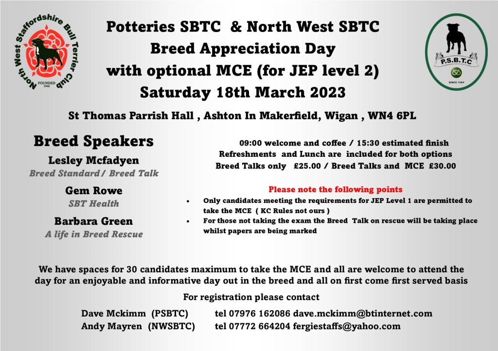 A really informative day was had by all, around 22 participants were in the hall to listen to Clare Lee share her vast experience of the Staffordshire Bull Terrier.