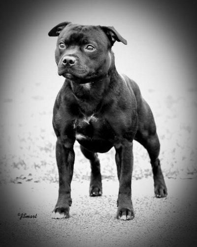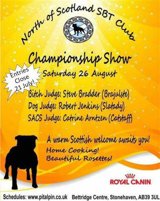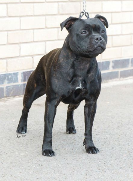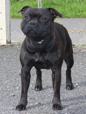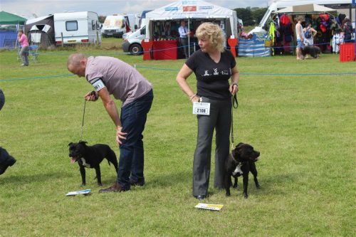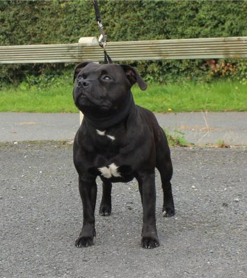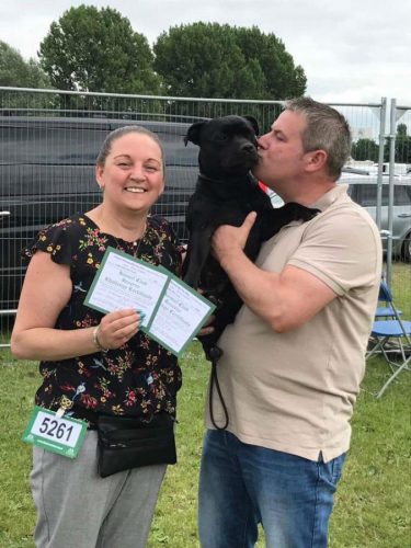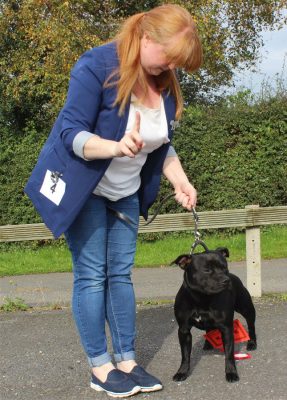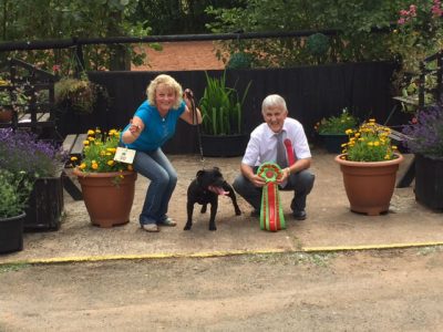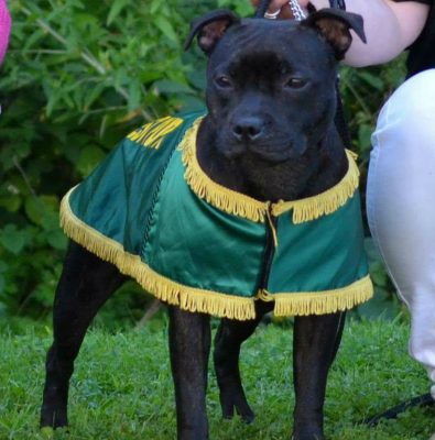 She’s pictured here winning Best In Show at the Staffordshire Bull Terrier Club Open under Judge Steve Simpson